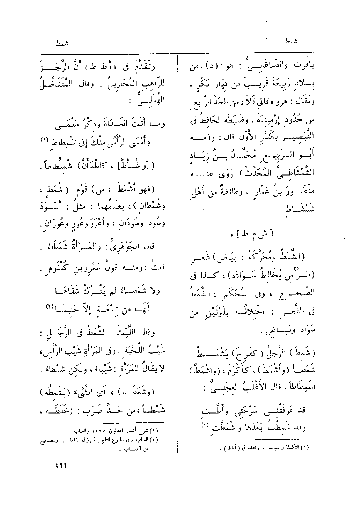 واشْمأَطَّ، كاطْمَأَنَّ اشْمِئطاطاً. فَهُوَ أَشْمَطُ، من قَوْم شُمْطٍ، وشُمْطانٍ، بضَمِّهما، مثلُ: أَسْوَدَ وسودٍ وسودانٍ، وأَعْوَرَ وعورٍ وعورانٍ. قالَ الجَوْهَرِيّ: والمَرْأَةُ شَمْطاءُ. قُلْتُ: ومِنْهُ قَوْلُ عَمْرو بن كُلْثومٍ: