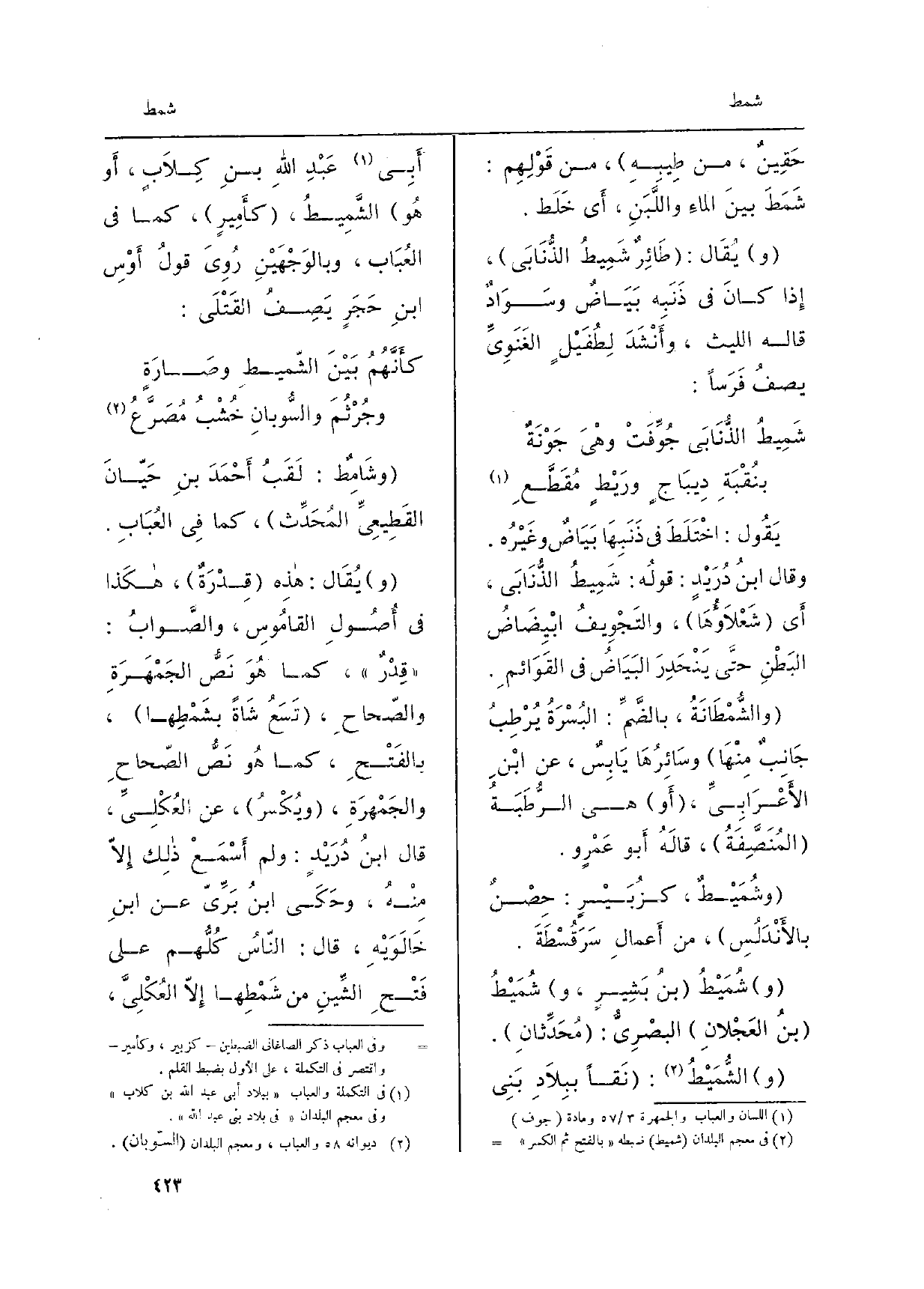 وشُمَيْطٌ، كزُبَيْرٍ: حِصْنٌ بالأنْدَلُسِ، من أَعْمالِ سَرَقُسْطَةَ. وشُمَيْطُ بنُ بَشيرٍ، وشُمَيْطُ بنُ العَجْلانِ البصْرِيُّ: مُحَدِّثانِ. والشُّمَيْطُ: نَقًا ببِلادِ بَني أَبي عَبْدِ اللهِ بن كِلابٍ، أَو هُوَ الشَّمِيطُ، كأَميرٍ، كَمَا فِي العُبَاب، وبالوَجْهَيْنِ رُويَ قَوْلُ أَوْسِ ابْن حَجَرٍ يَصِفُ القَتْلَى: