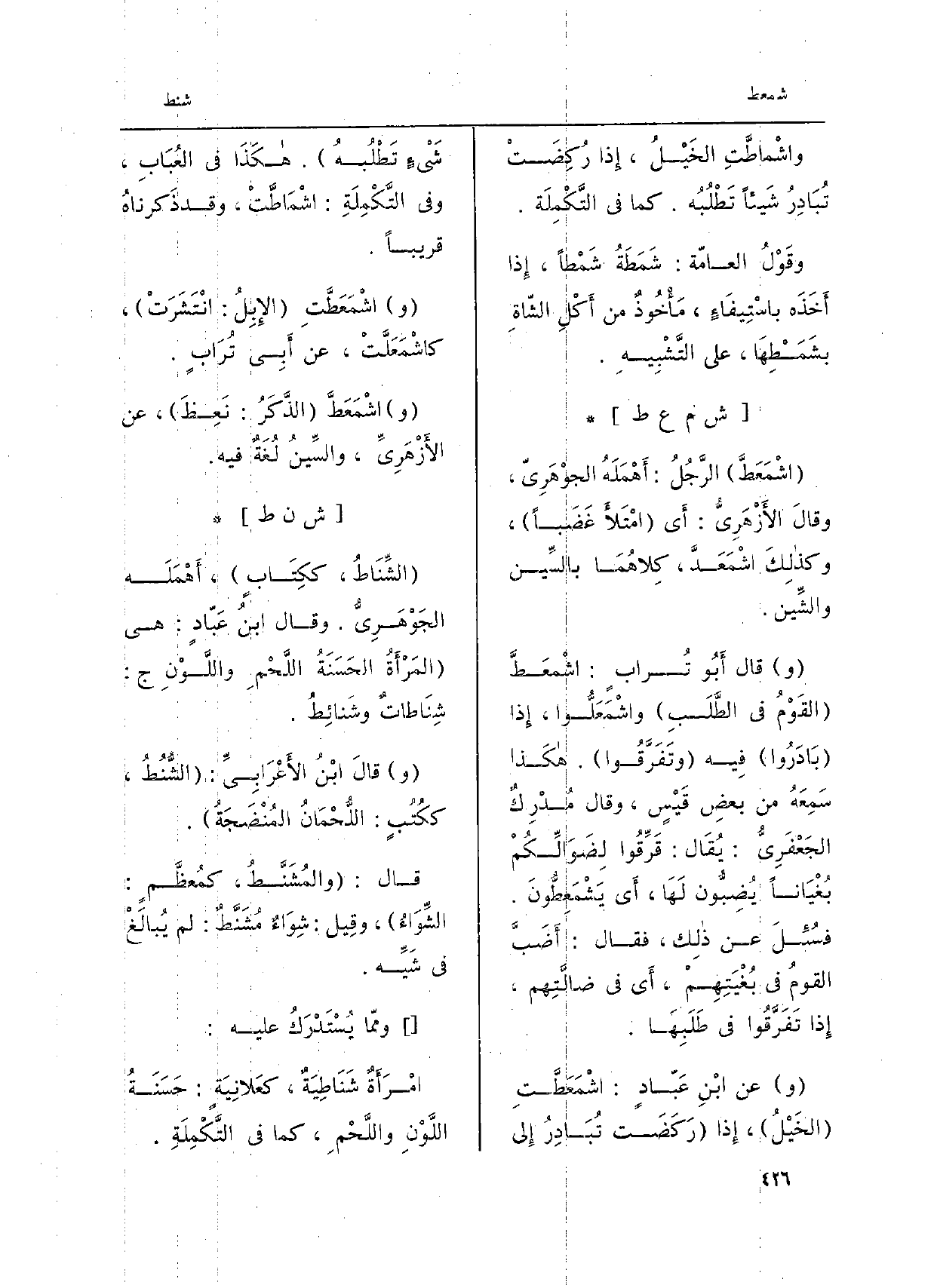 اشْمَعَطَّ الرَّجُلُ: أَهْمَلَهُ الجَوْهَرِيّ، وقالَ الأّزْهَرِيّ: أَي امْتَلأَ غَضَباً، وكَذلِكَ اشْمَعَدَّ، كِلاهُما بالسِّين والشِّين. وقالَ أَبُو تُرابٍ: اشْمعَطَّ القَوْمُ فِي الطَّلَبِ واشْمَعَلُّوا، إِذا بادَروا فِيهِ وتَفَرَّقوا. هَكَذا سَمِعَهُ من بعضِ قَيْسٍ، وقالَ مُدْرِكٌ الجَعْفَرِيُّ: يُقَالُ: قَرِّقُوا لِضَوَالِّكُمْ بُغْياناً يُضِبُّونَ لَهَا، أَي يَشْمَعِطُّونَ. فسُئِلَ عَن ذَلِك، فَقَالَ: أَضَبَّ القومُ فِي بُغْيَتِهِمْ، أَي فِي ضالَّتِهم، إِذا تَفَرَّقوا فِي طَلَبِها. وَعَن ابْن عَبّادٍ: اشْمَعَطَّتِ الخَيْلُ، إِذا رَكَضَت تُبادِرُ إِلَى شَيءٍ تَطْلِبُهُ. هَكَذا فِي العُبَاب، وَفِي التَّكْمِلَة: اشْماطَّتْ، وَقد ذَكرناهُ قَرِيبا. واشْمَعَطَّتِ الإِبِلُ: انْتَشَرَتْ، كاشْمَعَلَّتْ، عَن أَبي تُرابٍ. واشْمَعَطَّ الذَّكَرُ: نَعِظَ، عَن الأّزْهَرِيّ، والسِّينُ لُغَةٌ فِيهِ.
