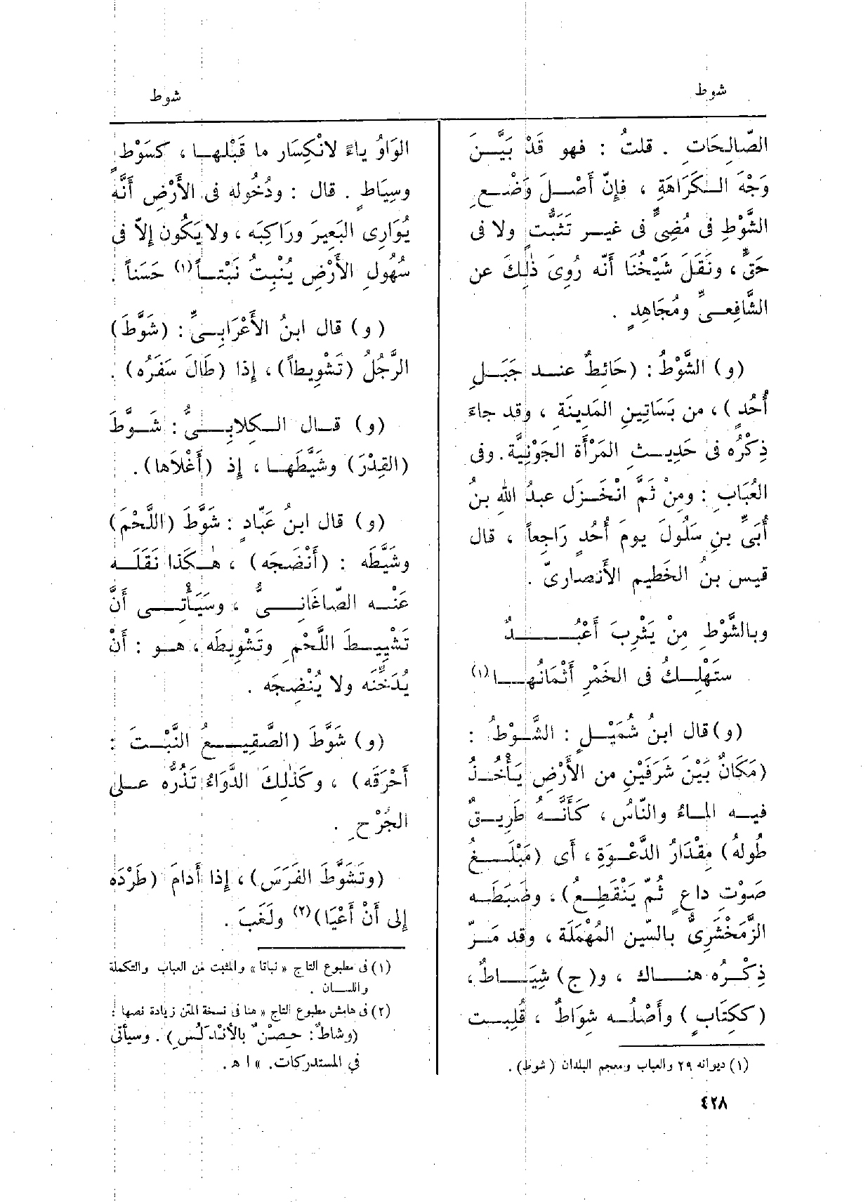 الصّالِحاتِ. قُلْتُ: فَهُوَ قد بَيَّنَ وَجْهَ الكَراهَةِ، فإِنَّ أَصْلَ وَضْعِ {الشَّوْطِ فِي مُضِيٍّ فِي غير تَثَبُّتٍ وَلَا فِي حَقٍّ، ونَقَلَ شَيْخُنا أَنَّهُ رُوِيَ ذلِكَ عَن الشَّافِعِيّ ومُجاهِدٍ. والشَّوْطُ: حائِطٌ عِنْد جَبَلِ أُحُدٍ، من بَساتينِ المَدينَةِ، وَقد جاءَ ذِكْرُه فِي حَديثِ المَرْأَة الجَوْنِيَّة. وَفِي العُبَاب: وَمن ثَمَّ انْخَزَل عَبْدِ اللهِ بن أُبَيِّ بن سَلولَ يومَ أُحُدٍ راجِعاً، قالَ قيس بنُ الخطيم الأَنصاريّ: