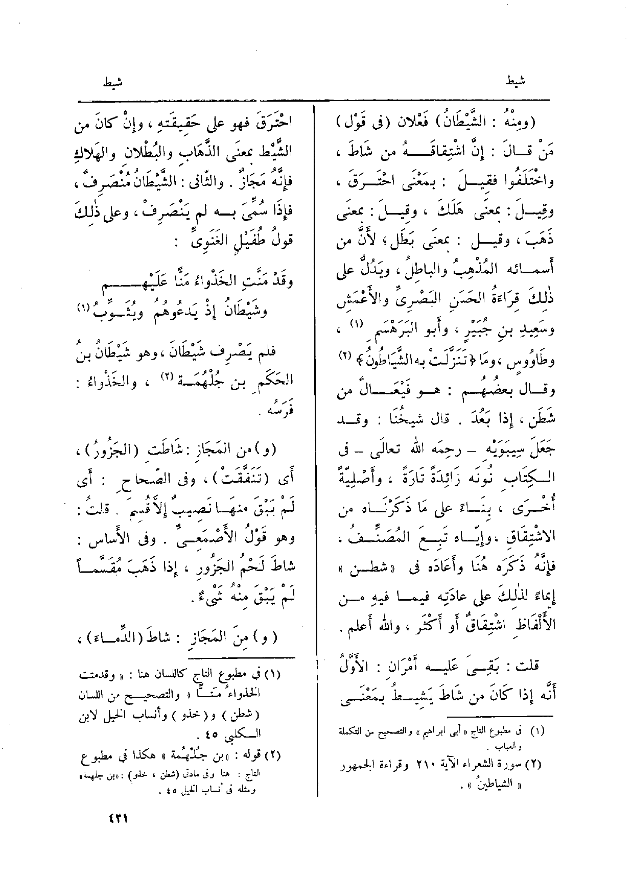 ومِنْهُ: {الشَّيْطانُ فَعْلان فِي قَوْلِ من قالَ: إنَّ اشْتِقاقَهُ من شاطَ، واخْتَلَفوا فقيلَ: بمَعْنَى احْتَرَقَ، وقِيل: بمعنَى هَلَكَ، وقِيل: بمعنَى ذَهَبَ، وقِيل: بمعنَى بَطَل لأنَّ من أَسمائه المُذْهِبُ والباطِلُ، ويَدُلُّ عَلَى ذلِكَ قِراءةُ الحَسَنِ البَصْرِيِّ والأَعْمَشِ وسعيدِ بن جُبَيْرٍ، وَأَبُو البَرَهْسَمِ، وطاوُوسٍ، وَمَا تَنَزَّلَتْ بِهِ} الشَّياطونُ وقالَ بعضُهُم: هُوَ فَيْعالٌ من شَطَن، إِذا بَعُدَ. قالَ شيخُنا: وَقد جَعَلَ سِيبَوَيْه رَحمَه الله تَعَالَى فِي الكِتابِ نونَه زائِدَةً تارَةً، وأَصْلِيّةً أُخْرى، بِناءً عَلَى مَا ذَكَرْناه من الاشْتِقاقِ، وإيّاه تَبِعَ المُصَنِّف، فإِنَّه ذَكَرَه هُنا وأَعادَه فِي شطن إِيمَاء لذَلِك عَلَى عادَتِه فِيمَا فِيهِ من الأَلْفاظِ اشْتِقاقٌ أَو أَكْثَر، وَالله أَعْلم. قُلْتُ: بَقِيَ عَلَيْهِ أَمْران: الأَوَّلُ أَنَّهُ إِذا كانَ من شاطَ يَشيطُ بمَعْنَى احْتَرَقَ فَهُوَ عَلَى حَقيقَته، وإنْ كانَ من الشَّيْط بمعنَى الذَّهابِ والبُطْلانِ والهَلاكِ فإِنَّه مَجازٌ. والثّاني: {الشَّيْطانُ مُنْصَرِفٌ، فَإِذا سُمِّيَ بِهِ لم يَنْصَرِف، وعَلى ذلِكَ قَوْلُ طُفَيْلٍ الغَنَويِّ: