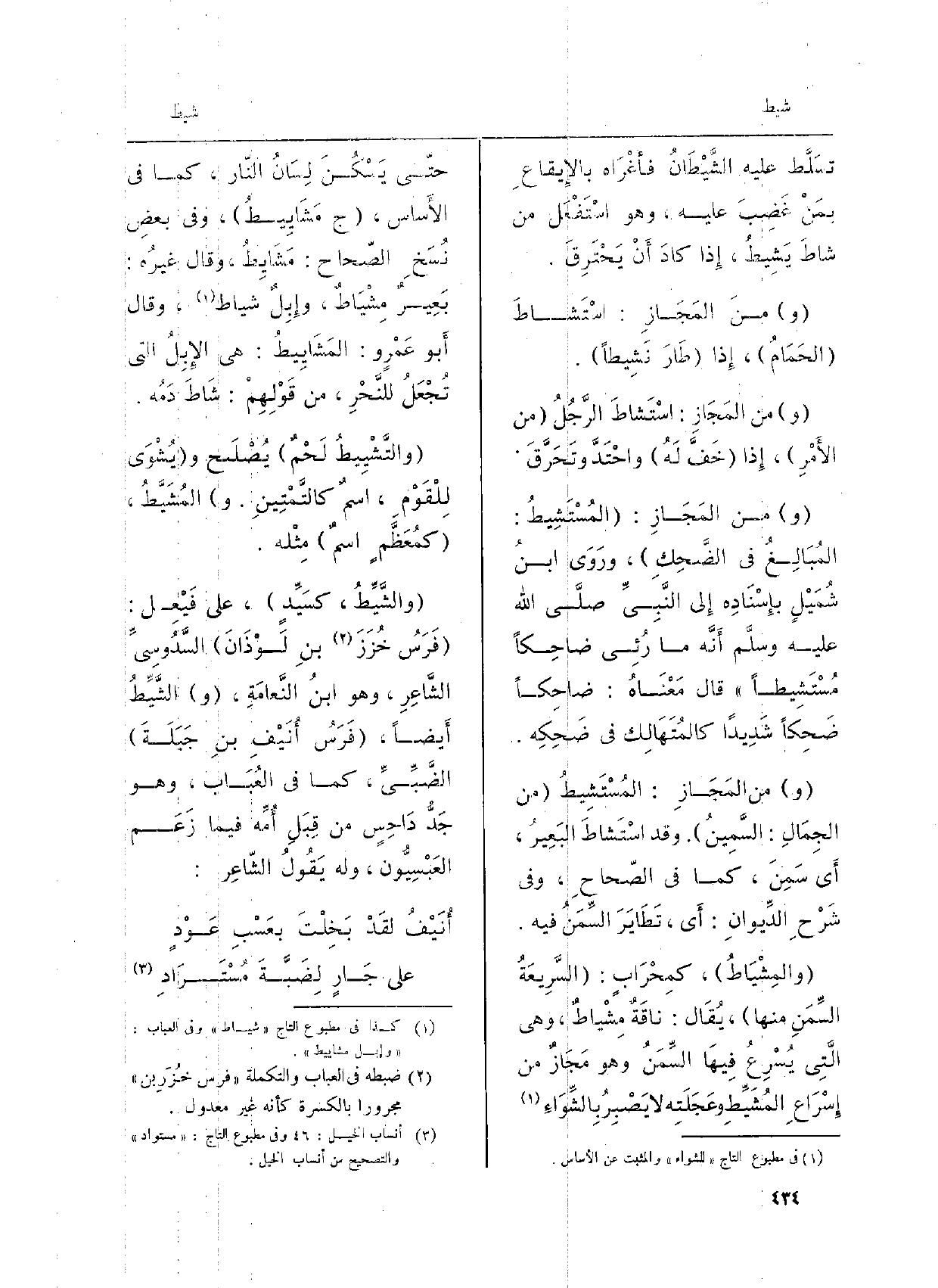 تسَلَّط عَلَيْهِ الشَّيْطانُ فأَغْراه بالإيقاعِ بمَنْ غَضِبَ عَلَيْهِ، وَهُوَ اسْتَفْعَل من شاطَ يَشيطُ، إِذا كادَ أنْ يَحْتَرِقَ. وَمن المَجَازِ: اسْتَشاطَ الحَمامُ، إِذا طارَ نَشيطاً. وَمن المَجَازِ: اسْتَشاطَ الرَّجُلُ من الأمْرِ، إِذا خَفَّ لهُ واحْتَدَّ وتَحَرَّقَ. وَمن المَجَازِ: {المُسْتَشيطُ: المُبالِغُ فِي الضَّحِكِ، ورَوَى ابْن شُمَيْلٍ بإسْنادِه إِلَى النَّبيِّ صَلّى اللهُ عَلَيْهِ وسَلّم أَنَّهُ مَا رُئي ضَاحِكا} مُسْتَشيطاً قالَ مَعْناه: ضاحِكاً ضَحِكاً شَديداً كالمُتَهالِك فِي ضَحِكِه. وَمن المَجَازِ: {المُسْتَشيطُ من الجِمالِ: السَّمينُ. وَقد اسْتَشاطَ البَعيرُ، أَي سَمِنَ، كَمَا فِي الصّحاح، وَفِي شَرحِ الدِّيوان: أَي، تَطايَرَ السِّمَنُ فِيهِ.} والمِشْياطُ، كمِحْرابٍ: السَّريعَةُ السِّمَنِ مِنْهَا، يُقَالُ: ناقَةٌ {مِشْياطٌ، وَهِي الَّتِي يُسْرِعُ فِيهَا السِّمَنُ وَهُوَ مَجازٌ من إسْراعِ} المُشَيِّطِ وعَجَلَتِه لَا يَصْبِرُ بالشِّواءِ حتَّى يَسْكُنَ لِسانُ النّار، كَمَا فِي الأَسَاسِ، ج {مَشَاييطُ، وَفِي بعض نُسَخِ الصّحاح:} مَشَايطُ، وقالَ غيرُه: بَعيرٌ {مِشْياطٌ، وإبْلٌ شياط، وقالَ أَبُو عَمْرٍ و: المَشَاييطُ: هِيَ الإِبِل الَّتِي تُجْعَلُ للنَّحْرِ، من قولِهِم: شاطَ دَمُه.} والتَّشْييطُ لَحْمٌ يُصْلَح ويُشْوَى لِلْقَوْمِ، اسمٌ كالتَّمْتينِ. والمُشَيَّطُ، كمُعَظَّمٍ اسمٌ مِثْله. {والشَّيِّطُ، كسَيِّدٍ، عَلَى فَيْعِلٍ: فَرَسُ خُزَزَ بن لَوْذانَ السَّدوسِيِّ الشَّاعِر، وَهُوَ ابْن النَّعامَةِ، (و) } الشَّيِّطُ أَيْضاً، فَرَسُ أُنَيْفِ بن جَبَلَةَ الضَّبِّيِّ، كَمَا فِي العُبَاب، وَهُوَ جَدُّ داحِسٍ من قِبَلِ أُمِّه فِيمَا زَعَم العَبْسِيُّون، وَله يَقُولُ الشَّاعِر:
