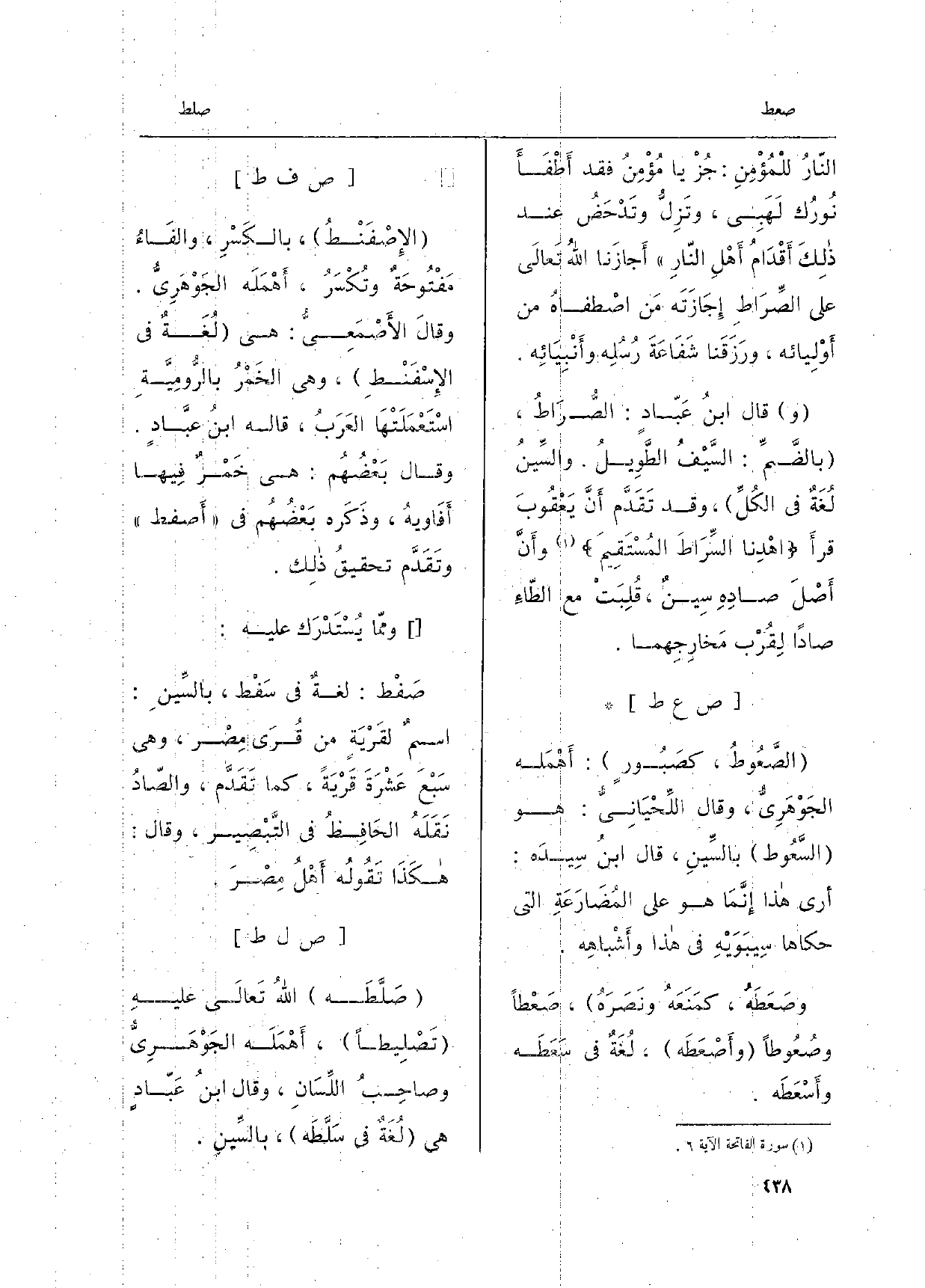 النَّارُ للمُؤْمِنِ: جُزْ يَا مُؤْمِنَ فَقَدْ أَطْفَأَ نورُكَ لَهَبِي، وتَزِلُّ وتَدْحَضُ عِنْد ذلِكَ أَقْدامُ أَهْلِ النَّارِ أَجازَنا الله تعالَى عَلَى الصِّرَاطِ إِجازَتَه مَن اصْطَفاهُ من أَوْلِيائه، ورَزَقَنَا شَفاعَةَ رُسُلِه وأَنْبِيائِه. وقالَ ابنُ عَبَّادٍ: الصُّرَاطُ، بالضَّمِّ: السَّيْفُ الطَّويلُ. والسِّينُ لغةٌ فِي الكُلِّ، وَقد تقدَّمَ أَنَّ يَعْقُوبَ قرَأَ: اهْدِنا السِّرَطَ المُسْتَقِيمَ: وأَنَّ أَصْلَ صادِهِ سِينٌ، فقُلِبَتْ مَعَ الطَّاءِ صاداً لقُرْبِ مَخارِجِهما.