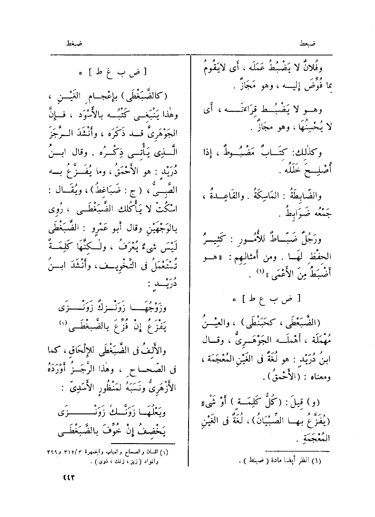 كالضَّبَغْطَى بإِعْجامِ الغَيْنِ، وَهَذَا يَنْبَغِي كَتْبُه بالأَسْوَدِ، فإِنَّ الجَوْهَرِيّ قد ذَكَرَهُ، وأَنْشَدَ الرَّجَزَ الَّذي يَأْتِي ذِكْرُه. وقالَ ابنُ دُرَيْدٍ: هُوَ الأَحْمَقُ، وَمَا يُفَزَّعُ بِهِ الصَّبِيُّ، ج: ضَبَاغِطُ، ويُقَالُ: اسْكُتْ لَا يَأْكُلك الضَّبَغْطَى، رُوِي بالوَجْهَيْن، وقالَ أَبُو عمرٍ و: الضَّبَغْطَى لَيْسَ شيءٌ يُعْرَفُ، ولكنَّها كَلِمَةٌ تُسْتَعْمَلُ فِي التَّخْويفِ، وأَنْشَدَ ابنُ دُرَيْدٍ: وزَوْجُها زَوَنْزَكٌ زَوَنْزَى يَفْزَعُ إِنْ فُزِّعَ بالضَّبَغْطَى والأَلِفُ فِي الضَّبَغْطَى للإِلْحاقِ، كَمَا فِي الصّحاح، وَهَذَا الرَّجَزُ أَوْرَدَه الأّزْهَرِيّ ونَسَبَه لمَنْظُورٍ الأَسَدِيّ: وبَعْلُها زَوَنَّكٌ زَوَنْزَى يَخْضِفُ إِنْ خُوِّفَ بالضَّبَغْطَى