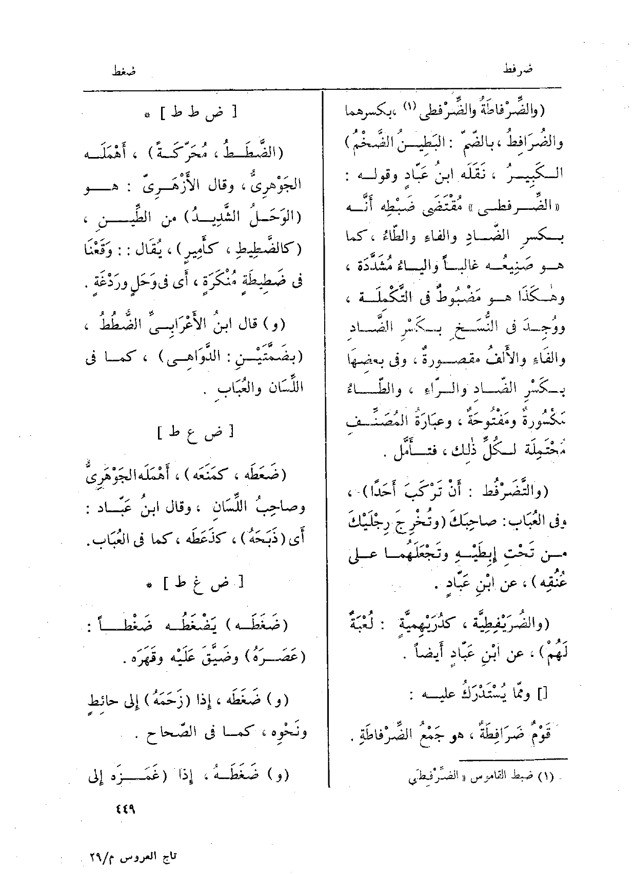 والضِّرْفاطَةُ والضِّرْفطى، بكسرهما والضُرافِطُ، بالضَّمِّ: البَطينُ الضَّخْمُ الكبيرُ، نَقَلَهُ ابنُ عبَادٍ وَقَوله: الضِّرفطى مُقتَضَى ضَبْطِه أَنَّه بكسرِ الضَّادِ والفاءِ والطَّاء، كَمَا هُوَ صَنِيعُه غَالِبا والياءُ مُشدَّدَة، وَهَكَذَا هُوَ مَضْبوطٌ فِي التَّكْمِلَة، ووُجِدَ فِي النُّسخِ بكسرِ الضَّادِ والفاءِ والأَلفُ مقصورةٌ، وَفِي بعضِها بكَسْرِ الضَّادِ والرَّاءِ، والطَّاءُ مَكْسورَةٌ ومَفْتوحَةٌ، وعِبارَةُ المُصَنِّف مُحْتَمِلَة لكلِّ ذَلِك، فتأَمَّلْ. والتَّضَرْفُط: أَن تَرْكَبَ أَحَداً، وَفِي العُبَاب: صاحِبَكَ وتُخْرِجَ رِجْلَيْكَ من تحتِ إِبْطَيْهِ وتَجْعَلَهُما على عُنُقِه، عَن ابنِ عبَادٍ.