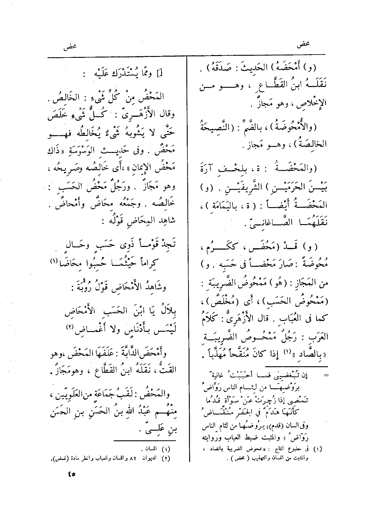 وشاهِدُ الأَمْحاضِ قَوْلُ رُؤْبَةَ: بِلالُ يَا ابنَ الحَسَبِ الأَمْحاضِ لَيْسَ بأَدْناسٍ وَلَا أَغْماضِ وأَمْحَضَ الدَّابَّةَ: عَلَفَها المَحْضَ، وَهُوَ القَتُّ، نَقَلَهُ ابنُ القَطَّاع، وَهُوَ مجازٌ. والمَحْضُ: لَقَبُ جماعَةٍ من العَلَوِيِّين، مِنْهُم عَبْدُ اللهِ بنُ الحَسَنِ بنِ الحَسَن بنِ عليّ.