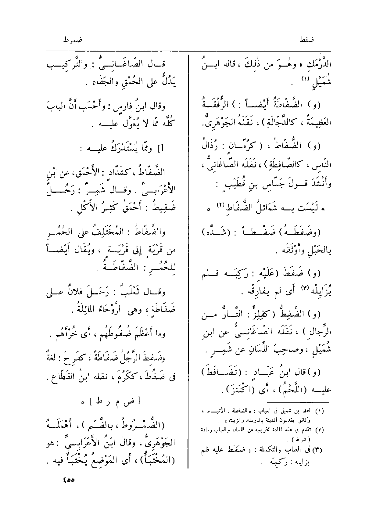 الدَّرْمَكِ وَهُوَ من ذَلِك، قَالَه ابنُ شُمَيْلٍ. والضَّفَّاطَةُ أَيْضاً: الرُّفْقَةُ العَظيمَةُ، كالدُّجَّالَةِ، نَقَلَهُ الجَوْهَرِيّ. والضُّفَّاطُ، كرُمَّانٍ: رُذالُ النَّاسِ، كالضَّافِطَةِ، نَقَلَهُ الصَّاغَانِيّ، وأَنْشَدَ قولَ جَسَّاسٍ بنِ قُطَيْبٍ: لَيْسَتْ بِهِ شَمَائلُ الضُّفَّاطِ وضَفَطَهُ ضَفْطاً: شدَّه بالحَبْلِ وأَوْثَقَه. وضَفَطَ عَلَيْهِ: رَكِبَه فَلم يُزَايِلْه أَي لم يفارِقْه. والضِّفِطُّ كفِلِزٍ: التَّارُّ من الرِّجالِ، نَقَلَهُ الصَّاغَانِيّ غن ابنِ شُمَيْلٍ، وصَاحِب اللِّسَان عَن شَمِرٍ. وقالَ ابنُ عبَادٍ: تَضَافَطَ عَلَيْهِ اللَّحْمُ، أَي اكْتَنَز. قالَ الصَّاغَانِيّ: والتَّركيب يدُلُّ على الحُمْقِ والجَفاءِ. وقالَ ابنُ فارسٍ: وأَحْسَب أَنَّ البابَ كلَّه ممَّا لَا يُعَوَّل عَلَيْهِ. وممَّا يُسْتَدْرَكُ عَلَيْهِ: الضَّفَّاطُ، كشَدَّادٍ: الأَحْمِقُ، عَن ابْن الأَعْرَابِيّ. وقالَ شَمِرٌ: رَجُلٌ ضَفِطٌ: أَحمقُ كَثيرُ الأَكْلِ. والضَّفَّاطُ: المُخْتَلِفُ على الحُمُرِ من قريةٍ إِلى قريةٍ، ويُقَالُ أَيْضاً للحُمُرِ: الضَّفَّاطَةُ. وقالَ ثَعْلَبٌ: رَحَلَ فلانٌ على ضَفَّاطَةٍ، وَهِي الرَّوْحاءُ المائلَةُ. وَمَا أَعْظَمَ ضُفُوطَهُم، أَي خُرْأَهُم. وضَفِطَ الرَّجُلُ ضَفَاطَةً، كفَرِحَ: لُغَةٌ فِي ضَفُطَ، ككَرُمَ، نَقَلَهُ ابنُ القطَّاعِ.