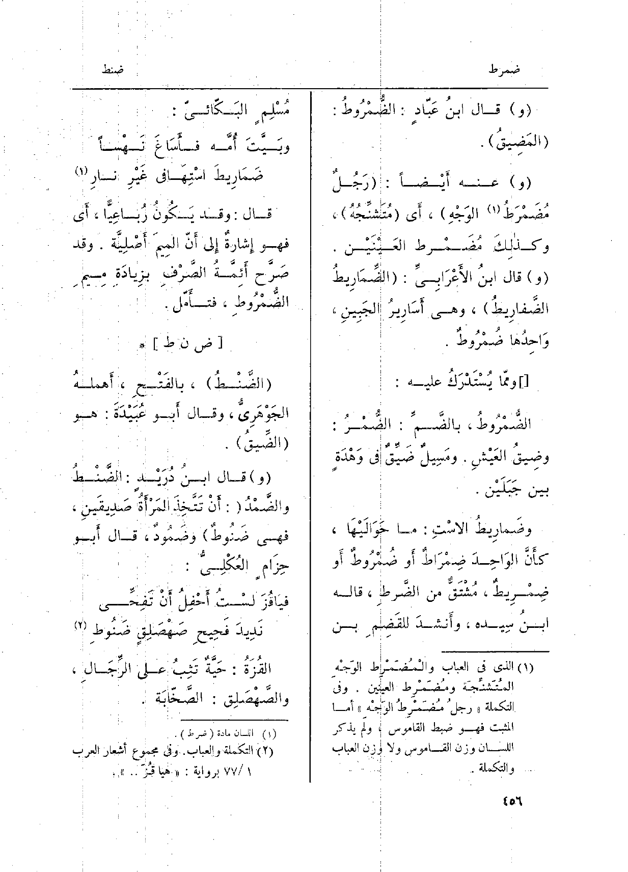 وقالَ ابنُ عبَادٍ: الضُّمْروطُ: المَضِيقُ. وَعنهُ أَيْضاً: رَجُلٌ مُضَمْرَطُ الوجهِ، أَي مُتَشَنِّجُه، وكذلِكَ مُضَمْرَطُ العَيْنَيْن. وقالَ ابْن الأَعْرَابِيّ: الضّمَارِيطُ الضَّفاريطُ، وَهِي أَسَاريرُ الجَبِينِ، واحِدُها ضُمْرُوطٌ. وممَّا يُسْتَدْرَكُ عَلَيْهِ: الضُّمْروطُ، بالضَّمِّ: الضُّمْرُ، وضِيقُ العَيْشِ. ومَسِيلٌ ضَيِّقٌ فِي وَهْدَةٍ بَين جَبَلَيْن. وضَماريطُ الاسْتِ: مَا حَوَالَيْها، كأَنَّ الواحدَ ضِمْراطٌ أَو ضُمْرُوطٌ أَو ضِمْريطٌ، مُشْتَقٌّ من الضَّرْطِ، قَالَه ابنُ سِيدَه، وأَنْشَدَ للقَضِمِ بن مُسْلِمٍ البَكّائيّ: