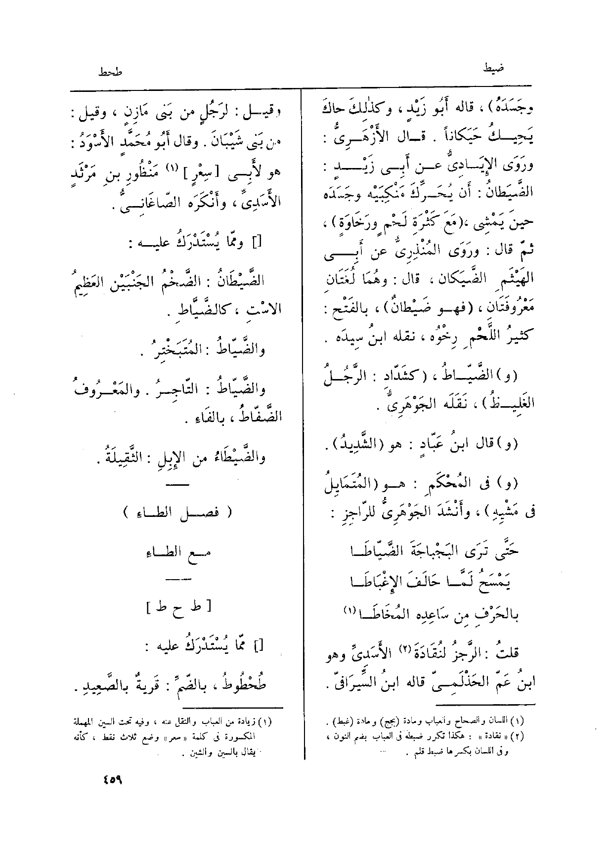 وجَسَدَه، قَالَه أَبُو زيدٍ، وَكَذَلِكَ حاكَ يَحِيكُ حَيَكاناً. قالَ الأّزْهَرِيّ: ورَوَى الإِيادِيُّ عَن أَبي زيدٍ: {الضَّيَطانُ: أَنْ يُحَرِّكَ مَنْكِبَيْهِ وجَسَدَه حينَ يَمْشي، مَعَ كَثْرَةِ لحمٍ ورَخَاوَةٍ، ثمَّ قالَ: ورَوَى المُنْذِرِيُّ عَن أَبي الهَيْثَمِ الضَّيَكان، قالَ: وهُما لُغَتانِ مَعْروفَتانِ، فَهُوَ} ضَيْطانٌ، بالفَتْحِ: كثير اللَّحْمِ رِخْوُه، نَقَلَهُ ابنُ سِيدَه. (و) {الضَّيَّاطُ، كشَدَّادٍ: الرَّجُلُ الغَليظُ، نَقَلَهُ الجَوْهَرِيّ. وقالَ ابنُ عَبَّادٍ: هُوَ الشَّديدُ. وَفِي المُحْكَمِ: هُوَ المُتَمايِلُ فِي مَشْيِهِ، وأَنْشَدَ الجَوْهَرِيّ للرَّاجِزِ: حتَّى تَرَى البَجْباجَةَ} الضَّيَّاطَا يَمْسَحُ لمَّا حَالَفَ الإِغْبَاطَا بالحَرْفِ من ساعِدِهِ المُخَاطَا قلتُ: الرَّجزُ لنُقادَةَ الأَسَدِيِّ وَهُوَ ابنُ عمِّ الحَذْلَمِيّ قَالَه ابنُ السِّيرافِيّ. وَقيل لرَجُلٍ من بني مازِنٍ، وَقيل: من بني شَيْبانَ. وقالَ أَبُو محمَّدٍ الأَسْوِدُ: هُوَ لأَبي سِعْرٍ مَنْظُورِ بنِ مَرْثَدٍ الأَسَدِيِّ، وأَنْكَرَهُ الصَّاغَانِيّ. وممَّا يُسْتَدْرَكُ عَلَيْهِ: {الضَّيْطانُ: الضَّخمُ الجَنْبَيْن العَظيمُ الاسْتِ،} كالضَّيَّاطِ.