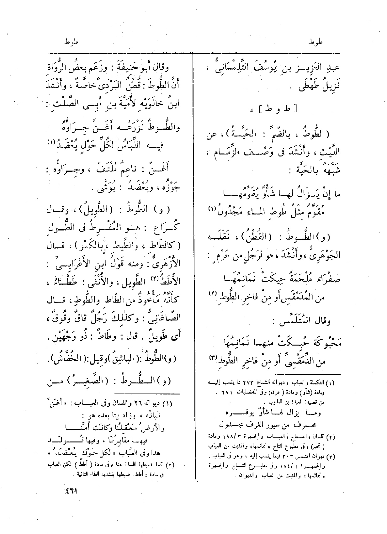 {الطُّوطُ، بالضَّمِّ: الحَيَّةُ، عَن اللَّيْثِ، وأَنْشَدَ فِي وَصْف الزِّمَام، شَبَّهَهُ بالحَيَّة: