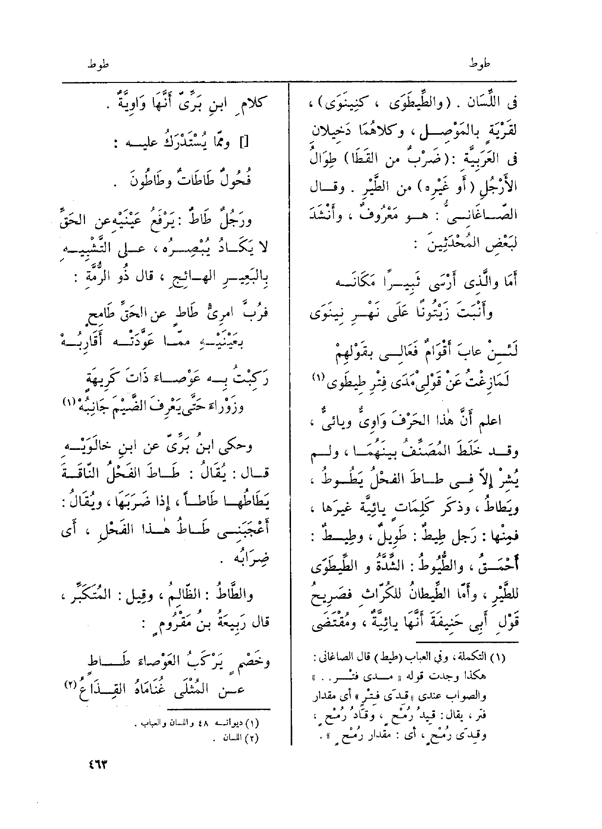 اعْلَم أَنَّ هَذَا الحَرْفَ واوِيٌّ ويائيٌّ. وَقد خلَطَ المُصَنِّفُ بَيْنَهما، وَلم يُشِرْ إلاّ فِي طاطَ الفَحْلُ {يَطُوطُ، ويَطاطُ، وذكَرَ كَلِماتٍ يائيَّةٍ غيرَها، فمِنْها: رَجُلٌ} طِيطٌ: طَويلٌ، وطِيطٌ: أَحْمَقُ، {والطُّيُوطُ: الشِّدَّةُ والطِّيطَوَى للطَّيّرِ، وأَمَّا} الطِّيطانُ للكُرَّاثِ فصَريحُ قولِ أَبي حَنِيفَةَ أَنَّها يائيَّةٌ، ومُقْتَضى كلامِ ابنِ بَرِّيّ أَنَّها واويَّةٌ. وممَّا يُسْتَدْرَكُ عَلَيْهِ: فحول {طَاطَاتٌ} وطَاطُونَ ورَجُلٌ طَاطٌ: يَرْفَعُ عَيْنَيْهِ عَن الحقِّ لَا يكادُ يُبْصِرُه، عَلَى التَّشْبيهِ بالبَعيرِ الهائجِ، قالَ ذُو الرُّمَّةِ: