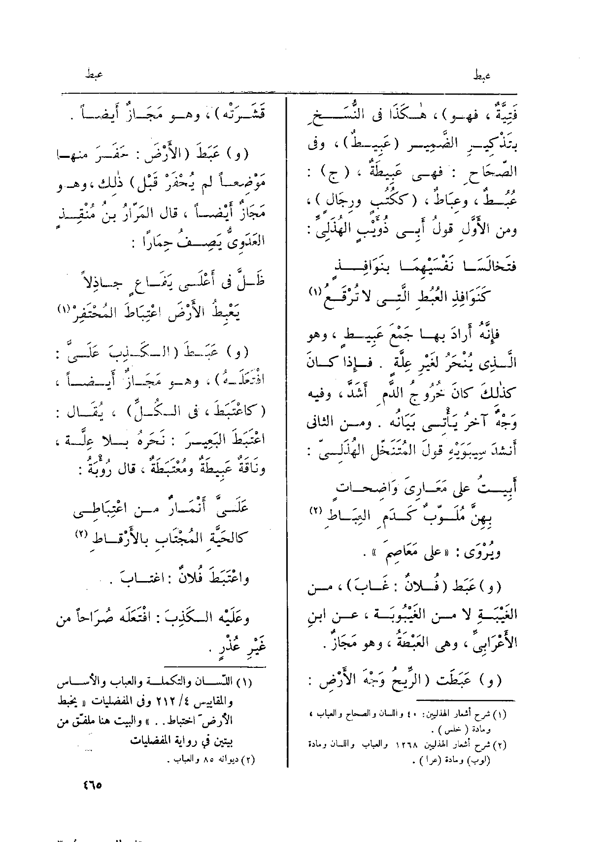 فإِنَّه أرادَ بهَا جمعَ عَبيطٍ، وَهُوَ الَّذي يُنْحَرُ لغيرِ عِلَّةٍ. فإِذا كَانَ كذلِكَ كَانَ خُرُوجُ الدَّمِ أَشَدَّ، وَفِيه وجهٌ آخرُ يأْتي بَيَانُه. وَمن الثَّاني أَنْشَدَ سيبَوَيْهِ قولَ المُتَنَخِّل الهُذَلِيّ: