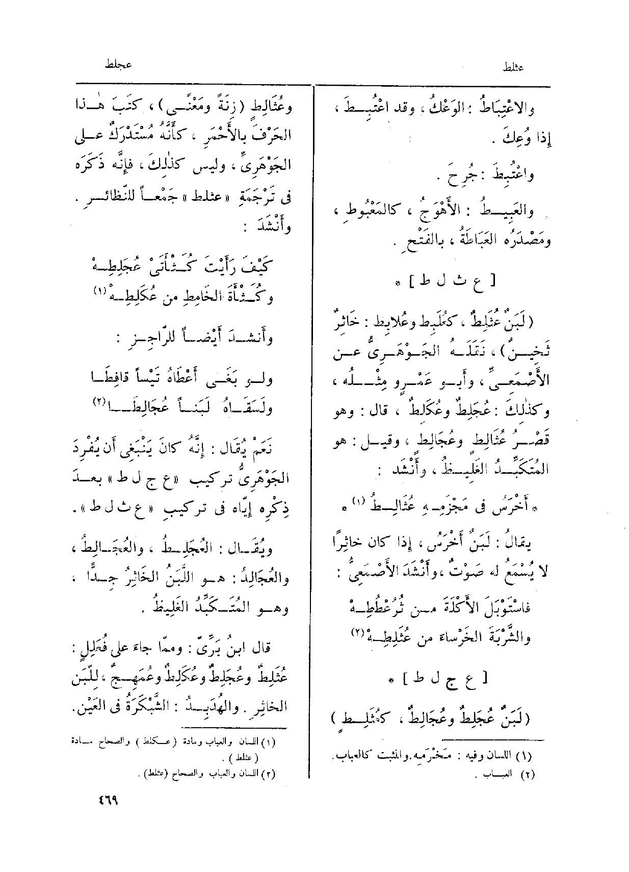 لَبَنٌ عُجَلِطٌ وعُجَالِطٌ، كعُثَلِطٍ وعُثَالِطٍ زِنَةً وَمعنى، كتَبَ هَذَا الحَرْفَ بالأَحْمَرِ، كأَنَّهُ مُسْتَدْرَكٌ عَلَى الجَوْهَرِيّ، وَلَيْسَ كَذَلِك، فإِنَّه ذَكَرَهُ فِي تَرْجَمَةِ عثلط جَمْعاً للنَّظائرِ. وأَنْشَدَ: كَيْفَ رَأَيْتَ كُثْأَتَيْ عُجَلِطِهْ وكُثْأَةَ الخامِطِ مِن عُكَلِطِهْ وأَنْشَدَ أَيْضاً للرَّاجِزِ: وَلَو بَغَى أَعْطاهُ تَيْساً قافِطَا ولَسَقَاهُ لَبَناً عُجَالِطَا نَعَمْ يُقَالُ: إِنَّهُ كَانَ ينْبَغِي أَن يُفْرِدَ الجَوْهَرِيّ تركيب ع ج ل ط بعدَ ذِكْرِه إِيَّاه فِي تركيب ع ث ل ط. ويُقَالُ: العُجَلِطُ، والعُجَالِطُ، والعُجَالِدُ: هُوَ اللَّبَنُ الخاثِرُ جِدَّا، وَهُوَ المُتَكَبِّدُ الغَليظُ. قالَ ابنُ بَرِّيّ: وممَّا جاءَ عَلَى فُعَلِلٍ: عُثَلِطٌ وعُجَلِطٌ وعُكَلِطٌ وعُمَهِجٌ، للَّبَنِ الخاثِرِ. والهُدَبِدُ: الشَّبْكَرَةُ فِي العَيْن.