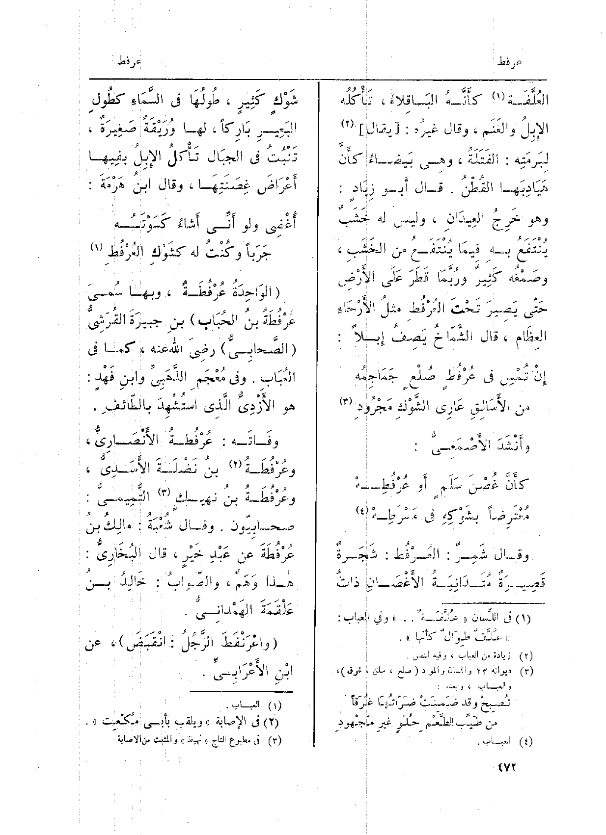 الواحِدَةُ: عُرْفُطَةٌ، وَبهَا سُمِّيَ عُرْفُطَةُ بنُ الحُبَاب بنِ جبيرَةَ القُرَشِيُّ الصَّحابيُّ رضيَ الله عَنهُ، كَمَا فِي العُبَاب. وَفِي مُعْجَمِ الذَّهَبِيِّ وابنِ فَهْدٍ: هُوَ الأَزْدِيُّ الَّذي استُشْهِدَ بالطَّائفِ. وفاتَه: عُرْفُطَةُ الأَنصارِيُّ، وعُرْفُطَةُ بنُ نَضْلَةَ الأَسَدِيّ، وعُرْفُطَةُ بنُ نهيكٍ التَّمِيميُّ: صحابيُّون. وقالَ شُعْبَةُ: مالِكُ بنُ عُرْفُطَةَ عَن عبدِ خَيْرٍ، قالَ البُخارِيُّ: هَذَا وَهَمٌ، والصَّوابُ: خالِدُ بنُ عَلْقَمَةَ الهَمْدانِيُّ. واعْرَنْفَطَ الرَّجُلُ: انْقَبَضَ، عَن ابْن الأَعْرَابِيّ.