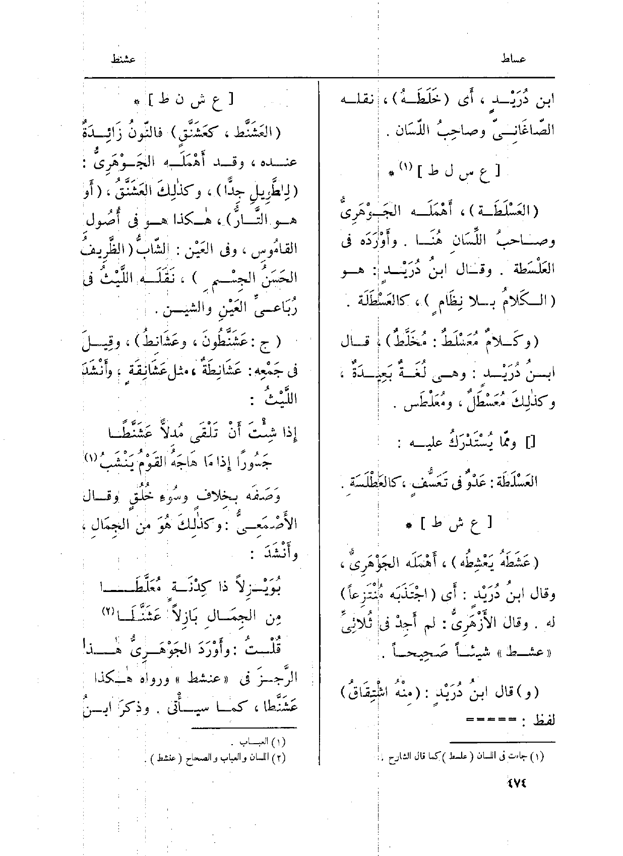 العَسْلَطَةُ، أهْمَلَهُ الجَوْهَرِيّ وصَاحِب اللِّسَان هُنا، وأَوْرَدَه فِي العَلْسَطة. وقالَ ابنُ دُرَيْدٍ: هُوَ الكلامُ بِلَا نِظامٍ، كالعَسْطَلَة. وكَلامٌ مُعَسْلَطٌ: مُخَلَّطٌ، قالَ ابنُ دُرَيْدٍ: وَهِي لُغَةٌ بَعيدةٌ، وكذلِكَ مُعَسْطَلٌ، ومُعَلْطَس. وممَّا يُسْتَدْرَكُ عَلَيْهِ: العَسْلَطَة: عَدْوٌ فِي تَعَسُّفٍ، كالعَطْلَسَةِ.