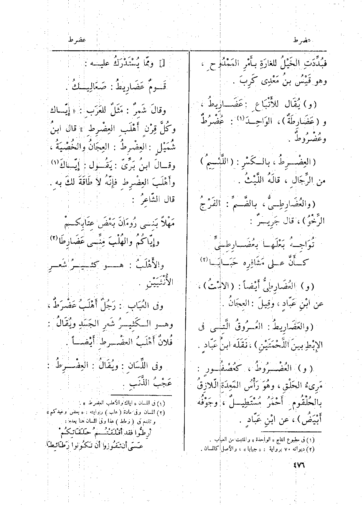 والعُضَارِطِيُّ أَيْضاً: الاسْتُ، عَن ابنِ عَبَّادٍ، وقِيلَ: العِجَانُ. والعَضَارِيطُ: العُروقُ الَّتِي فِي الإِبْطِ بَين اللَّحْمَتَيْنِ، نَقَلَهُ ابنُ عَبَّادٍ. والعُضْرُوطُ، كعُصْفُورٍ: مَرِئُ الحَلْقِ، وَهُوَ رأْسُ المَعِدَةِ الَّلازِقُ بالحُلْقُومِ أَحمَرُ مُسْتَطيلٌ، وجَوْفُه أَبْيَضُ، عَن ابنِ عَبَّادٍ. وممَّا يُسْتَدْرَكُ عَلَيْهِ: قومٌ عَضَارِيطُ: صَعَاليكُ. وقالَ شَمِرٌ: مَثَلٌ للعَرَبِ: إِيَّاكَ وكُلُّ قِرْنٍ أَهْلَبَ العِضْرِطِ قالَ ابنُ شُمَيْلٍ: العِضْرِطُ: العِجَانُ والخُصْيَةُ، وقالَ ابنُ بَرِّيّ: يَقُول: إِيَّاكَ وأَهْلَبَ العِضْرِطِ فإِنَّه لَا طاقَةَ لكَ بِهِ.