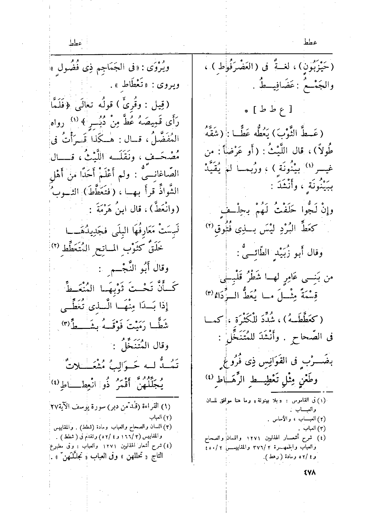 ويُرْوَى: فِي الجَمَاجِم ذِي فُضُولٍ. ويُرْوَى: تَعْطاطِ. قِيلَ: وقُرِئَ قولُه تَعَالَى: فَلَمَّا رَأَى قَمِيصَهُ} عُطَّ مِنْ دُبُرٍ رواهُ المُفَضَّلُ، قالَ: هَكَذَا قرأْتُ فِي مُصْحَفٍ، ونَقَلَهُ اللَّيْثُ، قالَ الصَّاغَانِيّ: وَلم أَعْلَم أَحداً من أَهلِ الشَّواذِّ قرأَ بهَا، {فتَعَطَّطَ الثَّوبُ} وانْعَطَّ، قالَ ابنُ هَرْمَةَ: