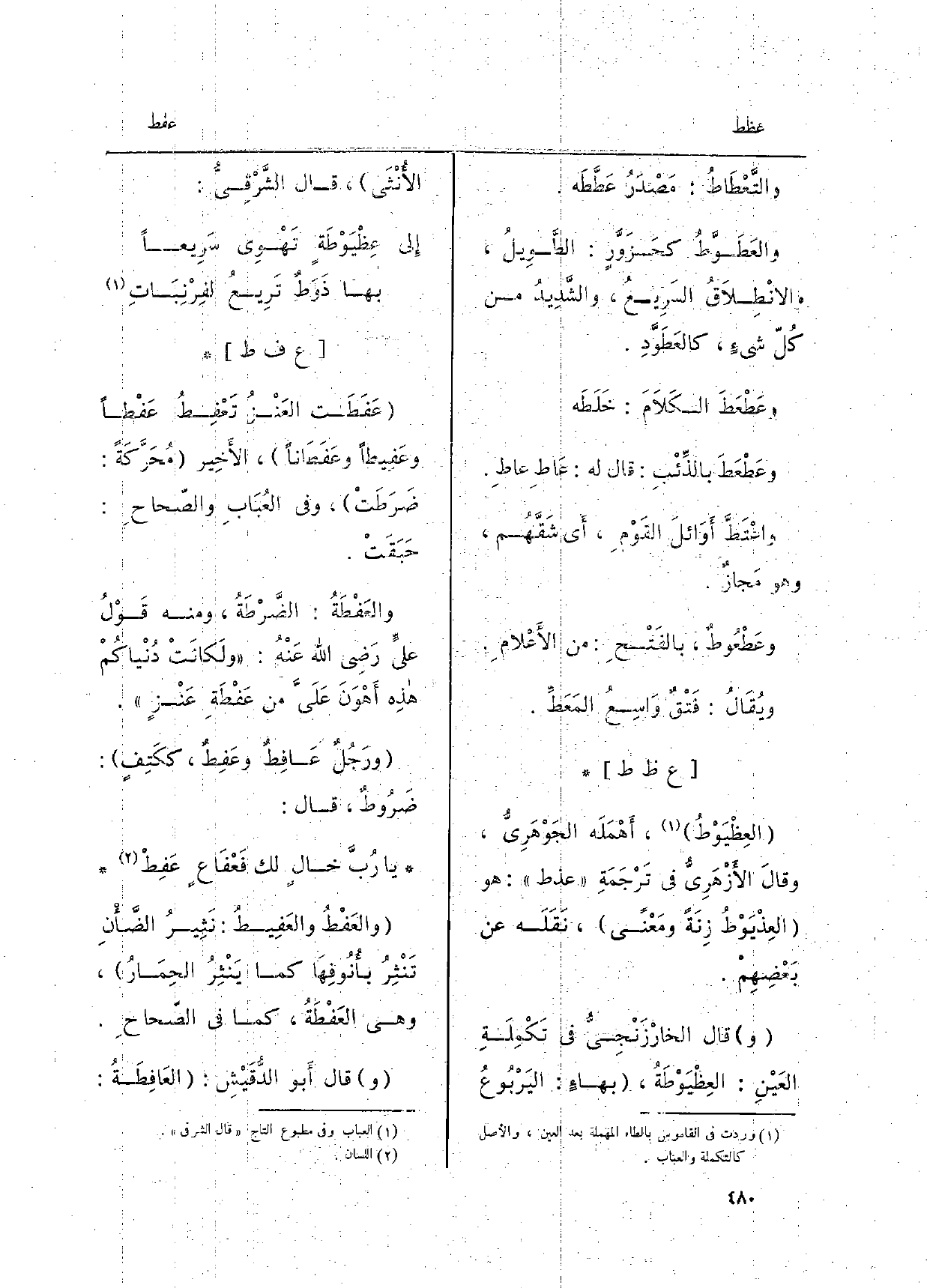 عَفَطَت العَنْزُ تَعْفِطُ عَفْطاً وعَفِيطاً وعَفَطَاناً، الأَخيرة محرَّكَةً: ضَرَطَتْ، وَفِي العُبَاب والصّحاح: حَبَقَتْ. والعَفْطَةُ: الضَّرْطَةُ، وَمِنْه قولُ عليٍّ رَضِي الله عَنهُ: ولَكانَتْ دُنْياكُمْ هَذِه أَهْوَنُ عَلَيَّ من عَفْطَةِ عَنْزٍ. ورَجُلٌ عافِطٌ وعَفِطٌ، ككَتِفٍ: ضَرُوطٌ، قالَ: يَا رُبَّ خالٍ لَك فَعْفَاعٍ عَفِطْ والعَفْطُ والعَفِيطُ: نَثِيرُ الضَّأْنِ تَنْثِرُ بأُنوفِها كَمَا يَنْثِرُ الحِمارُ. وعي العَفْطَةُ، كَمَا فِي الصّحاح.
