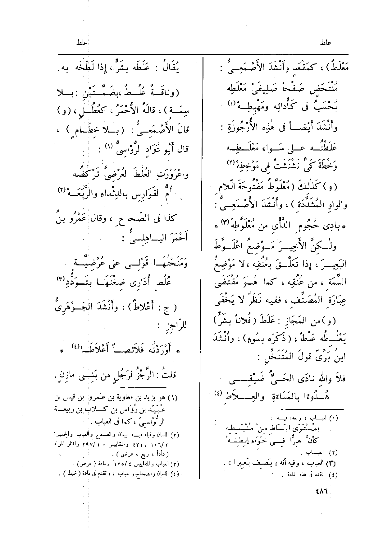 ) ج: أَعْلاطٌ، وأَنْشَدَ الجَوْهَرِيّ للرَّجزِ: أَوْرَدْتُه قَلاَئصاً أَعْلاَطَا قلتُ: الرَّجْزُ لرَجُلٍ من بَنِي مازِنٍ.