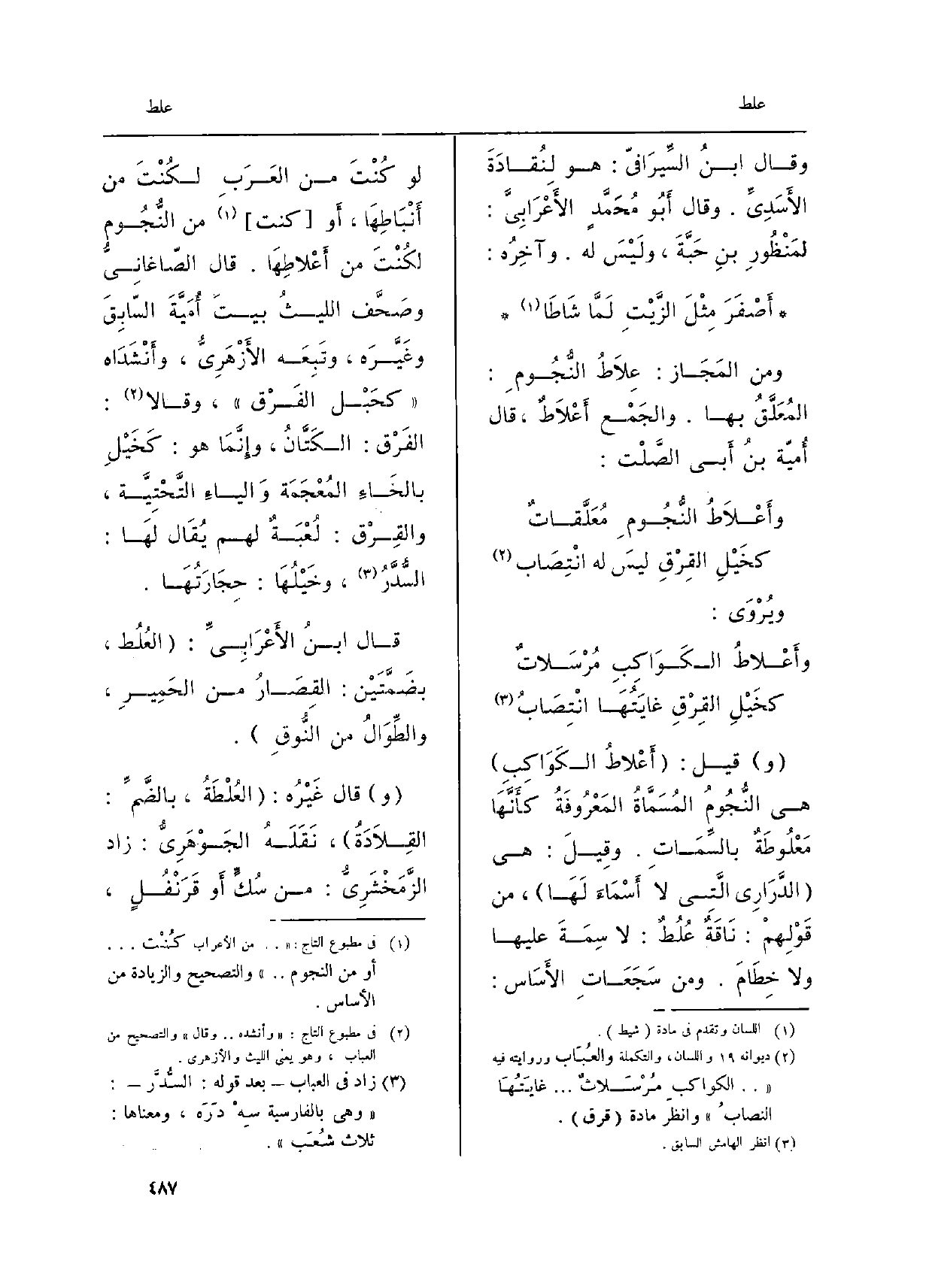 وَقيل: أَعْلاطُ الكَوَاكِبِ هِيَ النُّجومُ المُسَمَّاةُ المَعْروفَةُ كأَنَّها مَعْلُوطَةٌ بالسِّماتِ. وَقيل: هِيَ الدَّرَارِي الَّتِي لَا أَسْماءَ لَهَا، من قولِهمْ: ناقةٌ عُلُطٌ: لَا سِمَةَ عَلَيْهَا وَلَا خِطَامَ. وَمن سَجَعاتِ الأَسَاسِ: لَو كُنْتَ من العَرَبِ لكُنْتَ من أَنْباطِها، أَو كنت من النُّجومِ لكُنْتَ من أَعْلاطِها. قالَ الصَّاغَانِيّ وصحَّف اللَّيثُ بيتَ أُميَّةَ السَّابقَ وغيَّرَه، وتَبِعَه الأَزْهَرِيّ، وأَنْشَدَاه: كحَبْل الفَرْق، وَقَالا: الفَرْق: الكَتَّانُ، وإِنَّما هُوَ كخَيْلِ بالخاءِ المُعْجَمَة والياءِ التَّحْتِيَّة، والقِرْق: لُعْبَةٌ لَهُم يُقَالُ لَهَا: السُّدَّرُ، وخَيْلُها: حِجارِتُها. قالَ ابْن الأَعْرَابِيّ: العُلُط، بضَمَّتين: القِصارُ من الحَمِيرِ، والطِّوالُ من النُّوقِ. وقالَ غيرُه: العُلْطَةُ، بالضَّمِّ: القِلادَةُ، نَقَلَهُ الجَوْهَرِيّ. زادَ الزَّمَخْشَرِيّ: من سُكٍّ أَو قَرَنْفُلٍ،