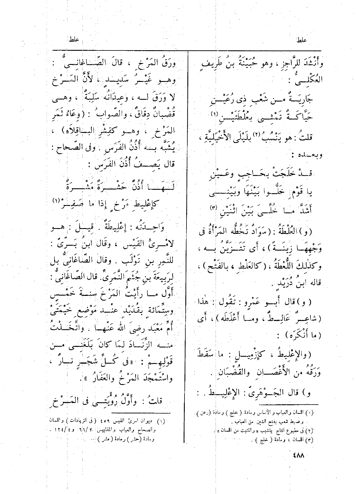 وأَنْشَدَ للرَّاجزِ، وَهُوَ حُبَيْنَةُ بنُ طَريفٍ العُكْلِيُّ: جَارِيَةٌ من شَعْبِ ذِي رُعَيْنِ حَيَّاكَةٌ تَمْشِي بعُلْطَتَيْنِ قلتُ: هُوَ يَنْسُبُ بلَيْلَى الأَخْيَلِيَّةِ، وَبعده: قدْ خَلَجَتْ بحَاجِبٍ وعَيْنِ يَا قَوْمِ خَلُّوا بَيْنَها وبَيْنِي أَشَدَّ مَا خُلِّيَ بَيْنَ اثْنَيْنِ والعُلْطَةُ: سَوادٌ تَخُطُّه المرأَةُ فِي وَجْهِها زِينَةً، أَي تَتَزَيَّنُ بِهِ، وكذلِكَ اللُّعْطَةُ، كالعَلْطِ، بالفَتْحِ، قالَهُ ابنُ دُرَيْدٍ. والإِعْلِيطُ، كإِزْميلٍ: مَا سَقَطَ وَرَقُهُ من الأَغْصانِ والقُضْبانِ. وقالَ الجَوْهَرِيّ:)