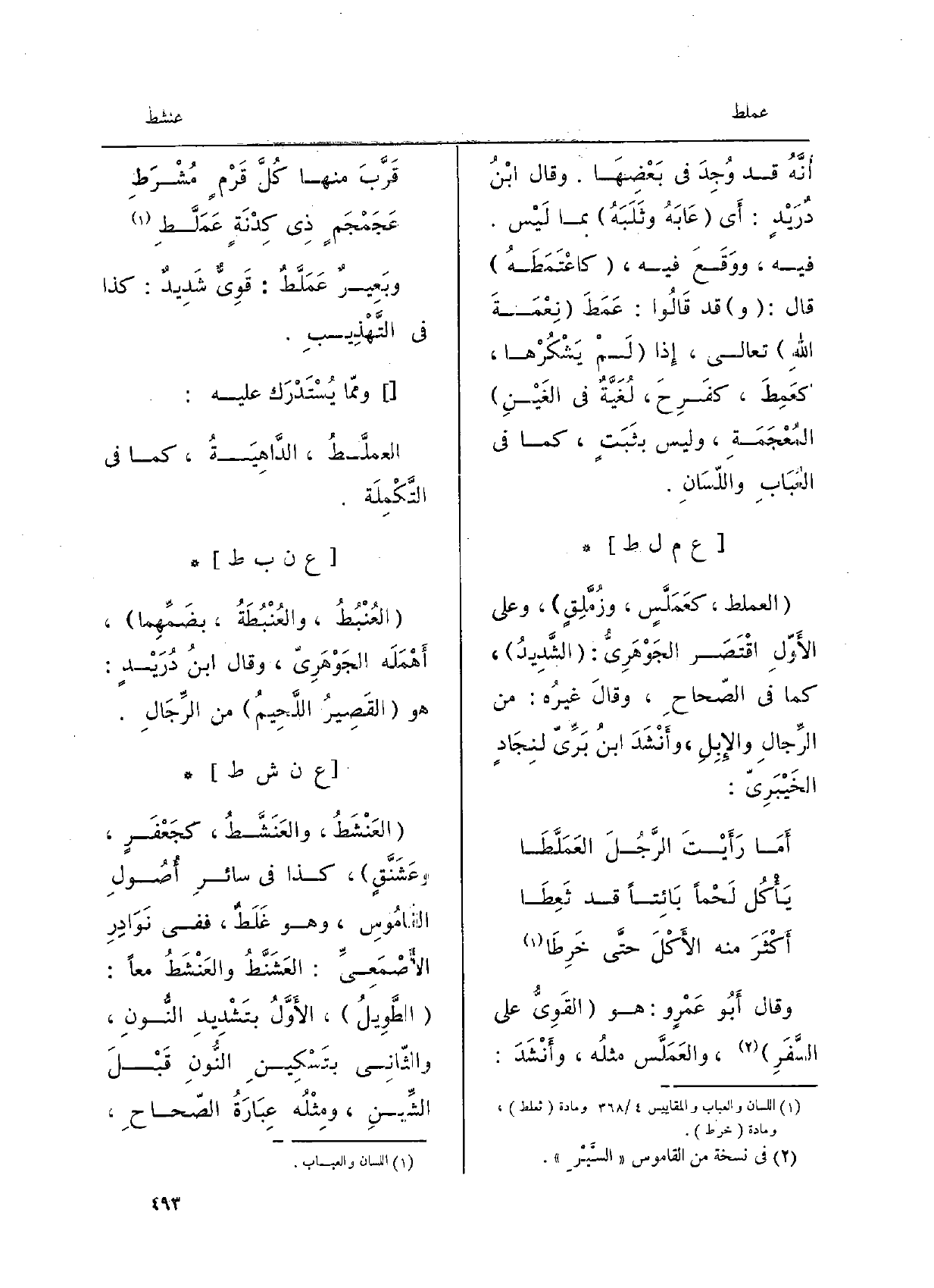 العَنْشَطُ، والعَنَشَّطُ، كجَعْفَرٍ، وعَشَنَّقٍ، كَذَا فِي سائرِ أُصولِ القاموسِ، وَهُوَ غَلَطٌ، فَفِي نوادِرِ الأصْمَعِيّ: العَشَنَّطُ والعَنْشَطُ مَعًا: الطَّويلُ، الأوَّلُ بتشْديدِ النُّونِ، والثَّاني بتَسْكينِ النُّونِ قبلَ الشِّينِ، ومثلُه عِبارَةُ الصّحاح،