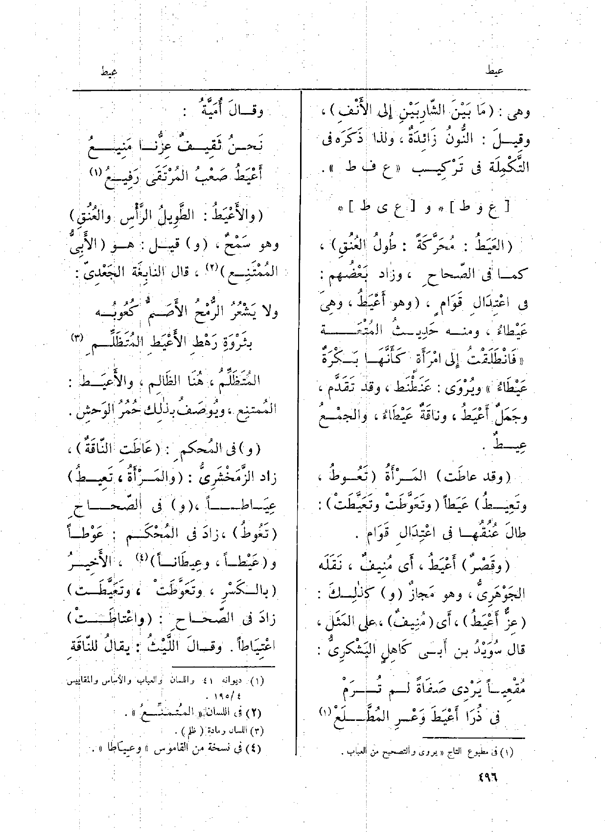 العَيْطُ: محرَّكةً: طولُ العُنُقِ، كَمَا فِي الصحّاح، وزادَ بعضُهم: فِي اعْتِدالِ قَوامٍ، وَهُوَ أَعْيَطُ، وَهِي عَيْطاءُ، وَمِنْه حديثُ المُتعة: فانْطَلَقْتُ إِلى امرأةٍ كأَنَّها بَكْرَةٌ عَيْطاءُ ويُروى عَنَطْنَط، وَقد تقدَّم، وجَمَلٌ أَعْيَطُ، وناقةٌ عَيْطاءُ، والجمعُ عِيطٌ. وَقد {عاطَت المرأَةُ} تَعُوطُ، وتَعيطُ عَيَطاً {وتَعَوَّطَتْ وتَعَيَّطَتْ: طالَ عُنُقُها فِي اعْتِدالِ قوامٍ. وقَصْرٌ أَعْيَطُ، أَي مُنِيفٌ، نَقله الجَوْهَرِيّ، وَهُوَ مجازٌ وَكَذَلِكَ: عِزٌّ أَعْيَطُ، أَي مُنيفٌ، على المَثَلِ، قَالَ سُوَيدُ بن أبي كاهِلٍ اليَشْكُريُّ: