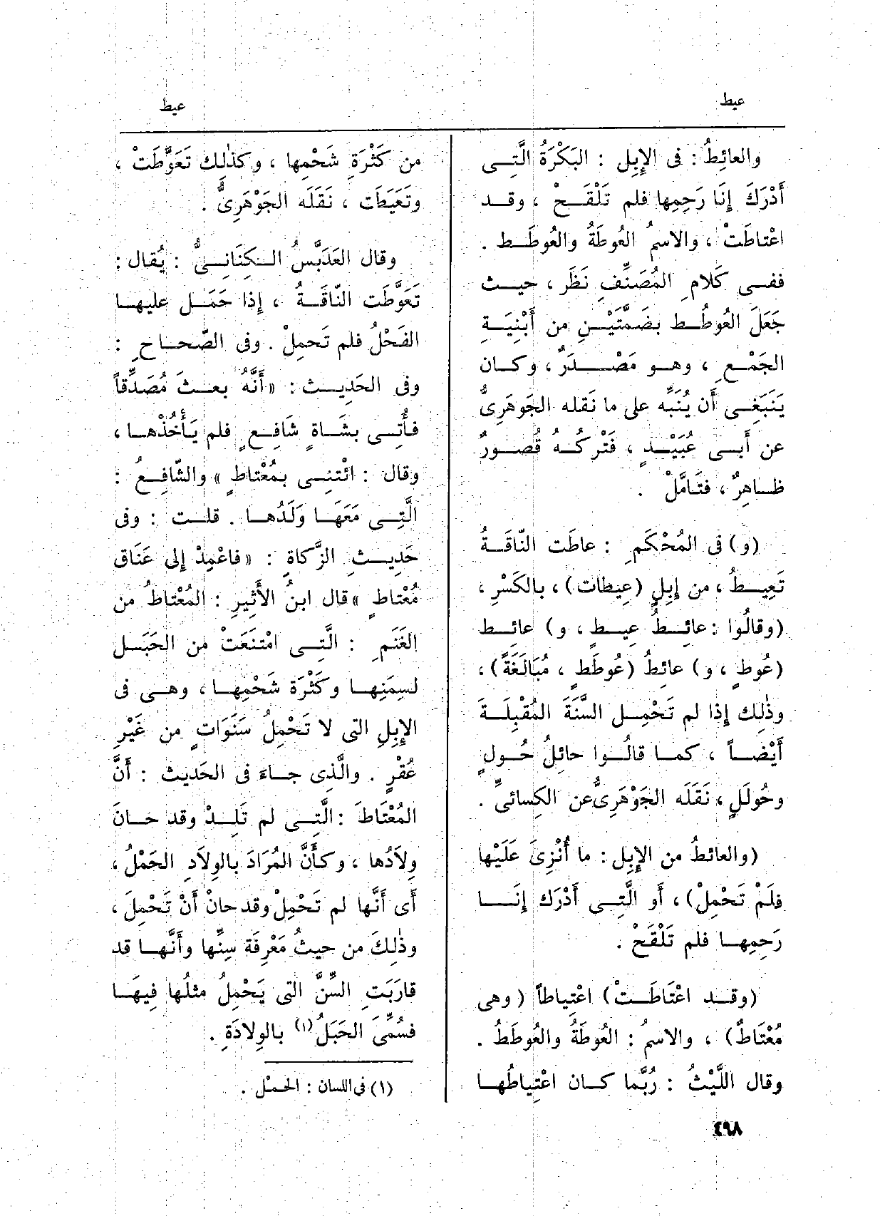 {والعائِطُ: فِي الإِبِل: البَكْرَةُ التَّي أَدْرَكَ إِنَّا رَحِمِها فَلم تَلْقَحْ، وَقد} اعْتاطَتْ، والاسمُ العُوطَةُ والعُوطَط. فَفِي كلامِ المصنِّفِ نَظَر، حَيْثُ جَعَلَ العُوطَط بضَمَّتَيْنِ من أَبْنِيَةِ الجمعِ، وَهُوَ مصدرٌ، وَكَانَ ينبَغي أَن يُنَبِّه على مَا نَقله الجَوْهَرِيّ عَن أَبي عُبيدٍ، فترْكُهُ قُصورٌ ظاهِرٌ، فتأَمَّلْ. وَفِي المُحكم: {عاطَت النَّاقَةِ} تَعيطُ، من إِبِلٍ {عِيطات، بالكسرِ، وَقَالُوا:} عائِطُ {عِيطٍ، وعائِطُ عُوطٍ، وعائِطُ عُوطَطٍ، مُبالغةً، وَذَلِكَ إِذا لم تَحْمِل السَّنَةَ المُقبلَةَ أَيضاً، كَمَا قَالُوا حائِلُ حُولٍ وحُولَلٍ، نَقله الجَوْهَرِيّ عَن الكِسائيِّ. والعائطُ من الإِبِل: مَا أُنْزِيَ عَلَيْهَا فَلم تَحْمِل، أَو الَّتي أَدْرَك إِنَّا رَحِمِها فَلم تَلْقَحْ. وَقد} اعْتاطَتْ {اعْتياطاً وَهِي مُعْتاطٌ، والاسمُ: العُوطَةُ والعُوطَطُ. وَقَالَ اللَّيثُ: رُبَّما كَانَ} اعْتِياطُها من كَثرَةِ شحمِها، وَكَذَلِكَ تَعَوَّطَتْ، {وتَعَيَّطَتْ، نَقله الجَوْهَرِيّ. وَقَالَ العَدَبَّسُ الكِنانيُّ: يُقال: تَعَوَّطَت النَّاقَةُ، إِذا حَمَل عَلَيْهَا الفحلُ فَلم تَحمِلْ. وَفِي الصّحاحِ: وقِي الحَدِيث: أَنَّهُ بعثَ مُصَدِّقاً فأُتِي بشاةٍ شافِعٍ فَلم يأخُذْها، وَقَالَ: ائْتِني} بمُعْتاطٍ والشَّافِعُ: الَّتِي معَها وَلَدُها. قلت: وَفِي حديثِ الزَّكاةِ: فاعْمِدْ إِلى عَنَاق! مُعْتاطٍ قَالَ ابنُ الأَثير: المُعْتاطُ من الغَنَمِ: الَّتي امْتَنَعَتْ من الحَبَل لسِمَنِها وَكَثْرَة شحمِها، وَهِي فِي الإِبل الَّتِي لَا تحمِلْ سَنَواتٍ من غيرِ عُقْرٍ. وَالَّذِي جَاءَ فِي الحَدِيث: أَنَّ المُعْتاطَ: الَّتي لم تَلِدْ وَقد حانَ وِلادُها، وكأَنَّ المُرادَ بالوِلادِ الحَمْلُ، أَي أَنَّها لم تَحْمِل وَقد حَان أَنْ تَحْمِلَ، وَذَلِكَ من حيثُ وعرِفَة سِنِّها وأَنَّها قد قارَبَتِ السِّنَّ الَّتِي يحمِلُ مثلُها فِيهَا فسُمِّيَ الحَبَلُ بالوِلادَةِ.