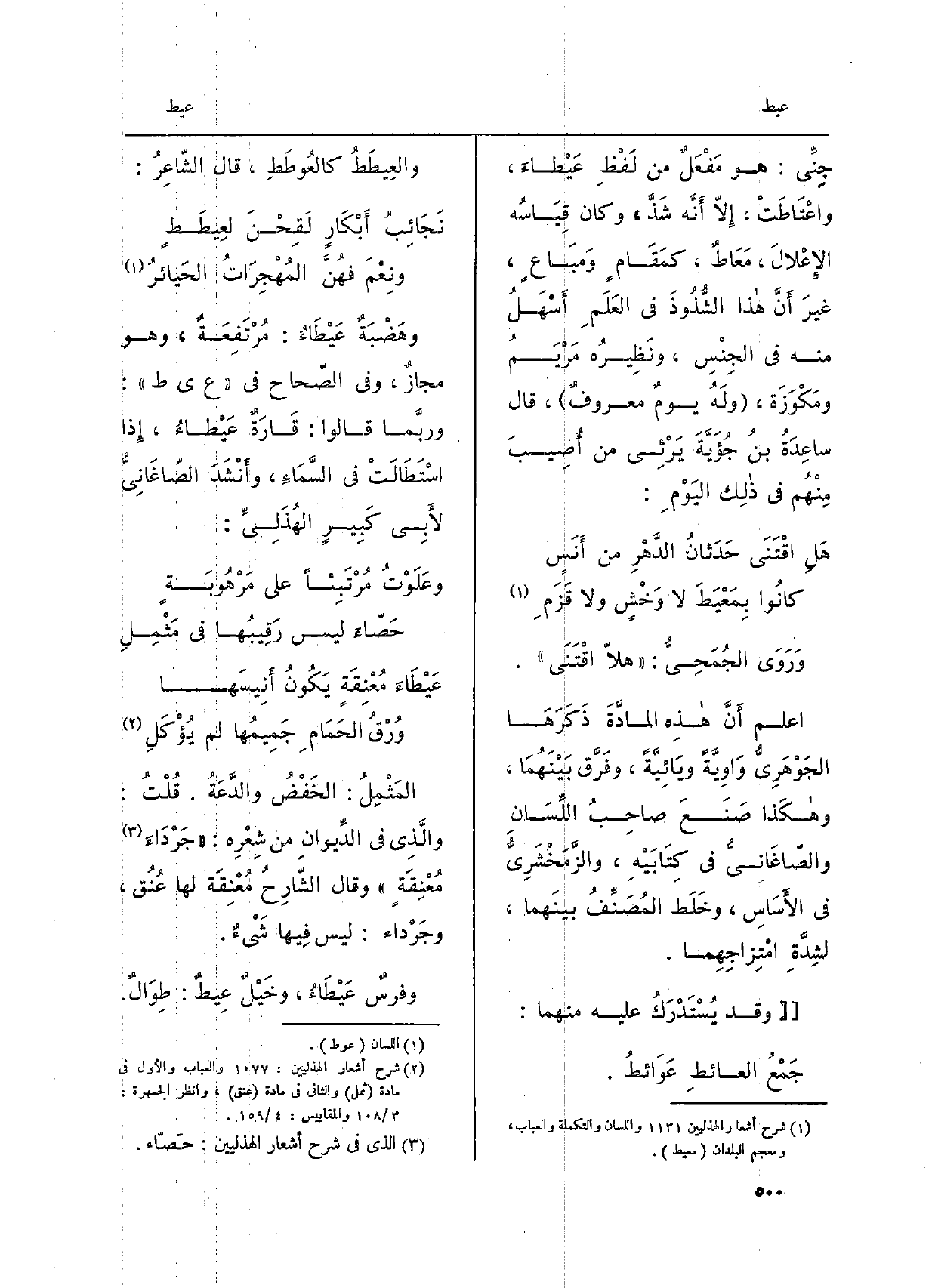 وروى الجُمَحِيُّ: هلاّ اقْتَنَى. اعْلَم أَنَّ هَذِه المادَّةَ ذَكَرَها الجوهريُّ واوِيَّةً ويائيَّةً، وفرَّق بَينهمَا، وَهَكَذَا صَنَعَ صاحبُ اللَّسان والصَّاغانيُّ فِي كِتابَيْهِ، والزَّمخشرِيُّ فِي الأَساسِ، وخَلَط المصنَّفُ بينَهما لشدَّةِ امْتِزاجِهِما. وممَّا يستدركُ عَلَيْهِ مِنْهُمَا: جَمْعُ} العائطِ {عَوَائطُ.} والعِيطَطُ كالعُوطَطِ، قَالَ الشَّاعرُ: