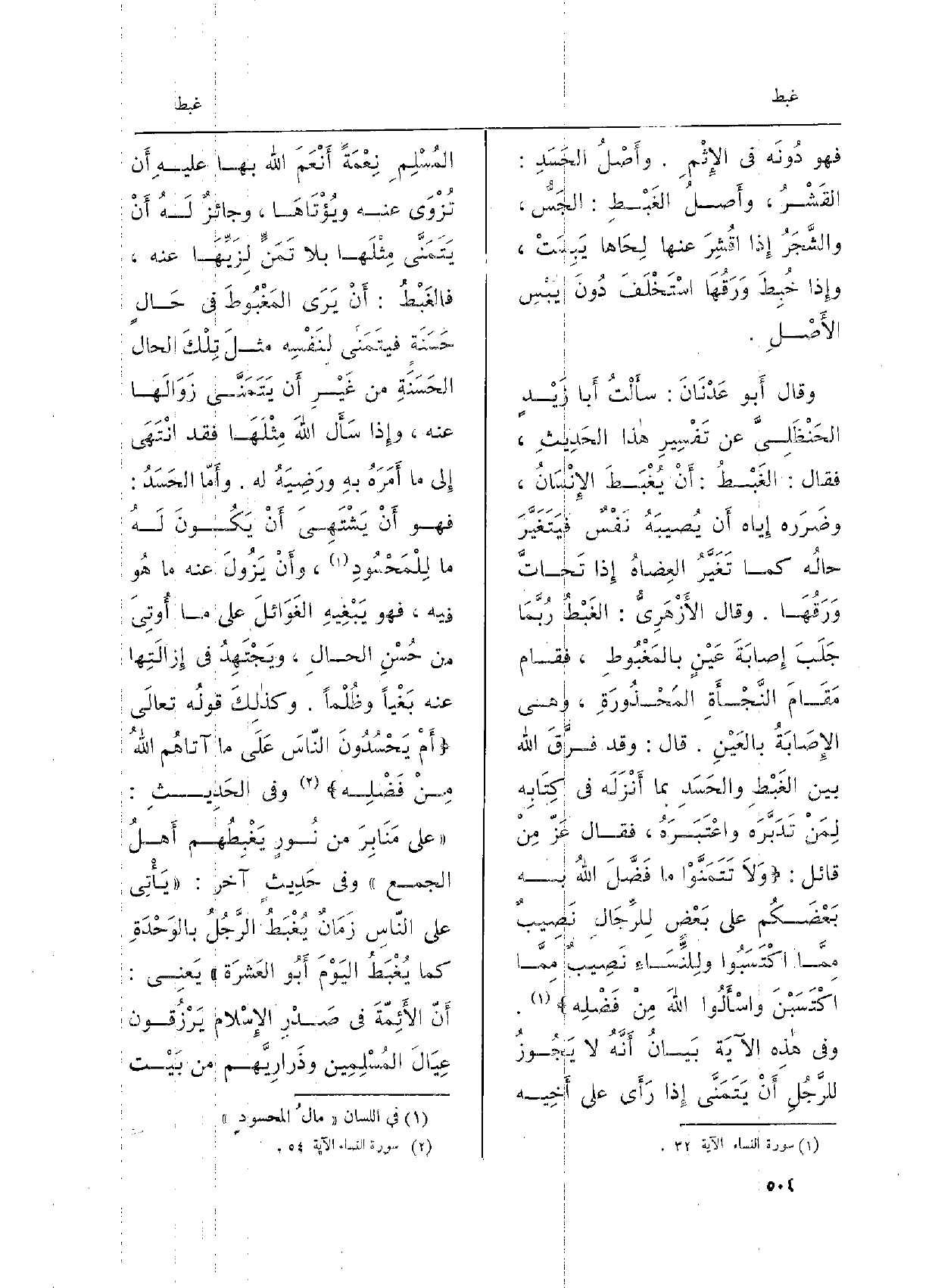 فَهُوَ دونَهُ فِي الإِثمِ. وأَصلُ الحَسَدِ القَشْرُ، وأَصلُ الغَبْطِ: الجَسُّ، والشَّجَرُ إِذا قُشِرَ عَنْهَا لِحاها يَبِسَتْ، وإِذا خُبِطَ وَرَقُها اسْتَخْلَفَ دونَ يُبْسِ الأَصلِ. وَقَالَ أَبو عَدْنانَ: سأَلتُ أَبا زَيْدٍ الحَنْظَلِيّ عَن تفسيرِ هَذَا الحَديثِ، فَقَالَ: الغَبْطُ: أَنْ يُغْبَطَ الإِنسانُ، وضَرَره إيَّاه أَن يُصيبَهُ نَفْسٌ فيَتَغَيَّرَ حالُه كَمَا تَغَيَّرُ العِضاهُ إِذا تَحاتَّ وَرَقُها. وَقَالَ الأَزهَرِيُّ: الغَبْطُ ربَّما جَلَبَ إصابَةِ عَيْنٍ بالمَغْبوطِ، فَقَامَ مَقامَ النَّجْأَةِ المَحْذورَةِ، وَهِي الإِصابَةُ بالعَيْنِ. قالَ: وَقد فرَّقَ اللهُ بينَ الغَبْطِ والحَسَدِ بِمَا أَنْزَلَهُ فِي كِتابِهِ لمَنْ تَدَبَّرَهُ واعْتَبَرَهُ، فَقَالَ عزَّ مِنْ قَائِل: وَلَا تَتَمَنَّوْا مَا فضَّلَ اللهُ بِهِ بعضَكُم على بَعْض للرِّجالِ نَصيبٌ ممَّا اكْتَسَبوا وللنِّساءِ نَصيبٌ ممَّا اكْتَسَبْنَ واسْأَلوا اللهَ مِنْ فَضْلِه. وَفِي هَذِه الآيَة بَيانُ أَنَّه لَا يَجوزُ للرَّجُلِ أَن يَتَمَنَّى إِذا رأَى على أَخيه المسلِمَ نِعْمَةً أَنعمَ الله بهَا عليهِ أَن تُزْوى عَنهُ ويُؤْتاها، وجائزٌ لهُ أَنْ يَتَمَنَّى مثلَها بِلَا تَمَنٍّ لِزَيِّها عَنهُ، فالغَبْطُ: أَن يرى المَغْبوطَ فِي حالٍ حسَنَةٍ فيتَمَنَّى لنفسِهِ مثلَ تِلكَ الْحَال الحَسَنَةِ من غيرِ أَن يَتَمَنَّى زَوَالَها عَنهُ، وإِذا سأَل الله مثلَهَا فقد انْتهى إِلى مَا أَمَرَهُ بهِ ورَضِيَهُ لَهُ. وأَمَّا الحَسَدُ: فَهُوَ أَن يَشْتَهِيَ أَن يكونَ لهُ مَا للمَحْسودِ، وأَن يزولَ عَنهُ مَا هُوَ فِيهِ، فَهُوَ يبغيهِ الغَوَائلَ على مَا أُوتيَ من حُسْنِ الحالِ، ويجْتَهِدُ فِي إزالَتِها عَنهُ بَغْياً وظُلْماً. وَكَذَلِكَ قَوْله تَعَالَى: أَمْ يَحسُدُونَ النَّاسَ على مَا آتَاهُم اللهُ من فَضْلِه وَفِي الحديثِ: على مَنَابِرَ من نورٍ يَغْبِطُهم أَهلُ الْجمع وَفِي حديثٍ آخر: يأْتي على النَّاسِ اليَوْمَ أَبو العَشرَة يَعْنِي: أَنَّ الأَئمَّةَ فِي صَدْرِ الإِسلام يَرْزُقون عِيالَ المُسْلِمين وذَرارِيَّهم من بَيت