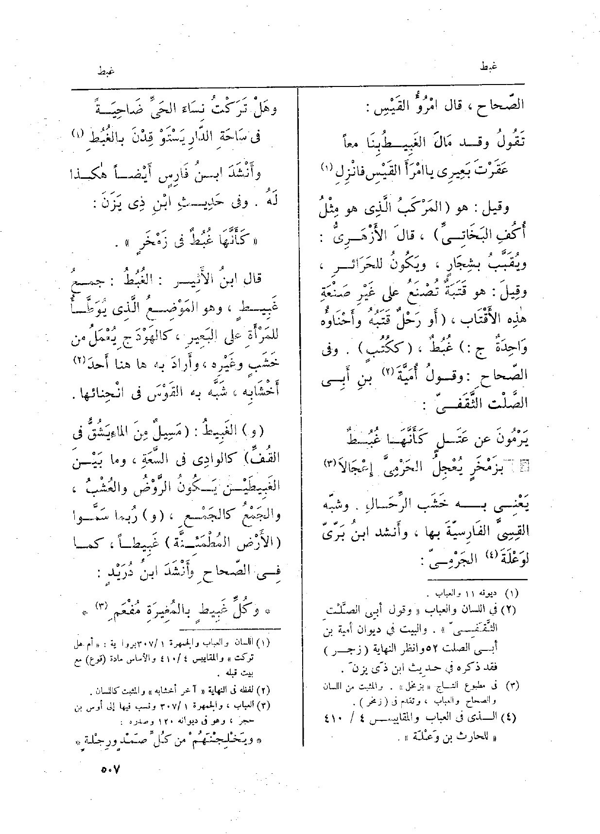 وأَنشَدَ ابنُ فارسٍ أَيضاً هَكَذَا لهُ. وَفِي حديثِ ابنِ ذِي يَزَنَ: كأَنَّها غُبٌ طٌ فِي زَمْخَرِ. قَالَ ابنُ الأَثيرِ: الغُبُطُ: جمعُ غَبِيطٍ، وَهُوَ الموضِعُ الَّذي يُوَطَّأُ للمرأَةِ على البَعيرِ، كالهَوْدَجِ يُعْمَلُ من خَشَبٍ وغيرِه، وأَرادَ بِهِ هَاهُنَا أَحدَ أَخْشابِه، شَبَّه القَوْسَ فِي انْحِنائها. والغَبِيطُ: مَسيلٌ من الماءِ يَشُقُّ فِي القُفِّ كالوادي فِي السَّعَةِ، وَمَا بينَ الغَبِيطَيْن يَكونُ الرَّوْضُ والعُشْبُ، والجمعُ كالجمعِ، ورُبَّما سمُّوا الأَرْض المُطْمَئِنَّة غَبيطاً، كَمَا فِي الصحّاح وأَنشَدَ ابنُ دُرَيْدٍ: وكلِّ غَبِيطٍ بالمُغِيرَةِ مُفْعَمِ