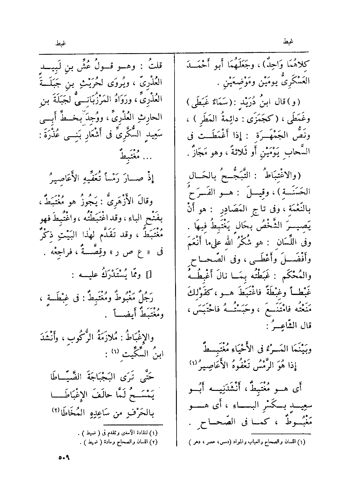أَي هُوَ مُغْتَبِطٌ، أَنْشَدَنِيه أَبو سَعيدٍ بكَيْرِ الباءِ، أَي هُوَ مَغْبُوطٌ، كَمَا فِي الصّحاح. قلتُ: وَهُوَ قولُ عُشِّ بنِ لَبيدٍ العُذْرِيّ، ويُروى لحُرَيْثِ بنِ جَبَلَةَ العُذْرِيّ، ورَواه المَرْزُبانيُّ لجَبَلَةَ بنِ الحارِثِ العُذْرِيِّ، ووُجِدَ بخطِّ أَبي سَعيدٍ السُّكَّرِيِّ فِي أَشْعارِ بَني عُذْرَةَ: مُغْتَبِطٌ. إِذا صارَ رَمْساً تُعَفِّيهِ الأَعاصيرُ. وقالَ الأَزْهَرِيُّ: يَجوزُ هُوَ مُغْتَبَطٌ، بفتحِ الباءِ، وَقد اغْتَبَطْتُهُ، واغْتُبِطَ فَهُوَ مُغْتَبَطٌ، وَقد تقدَّمَ لهَذَا البيتِ ذِكرٌ فِي ع ص ر وقِصَّةٌ فراجِعْه. وممَّا يُسْتَدْرَكُ عَلَيْهِ: رَجُلٌ مَغْبوطٌ ومُغْتَبِطٌ: فِي غِبْطِةٍ، ومُغْتَبطٌ أَيْضا. والإِغْباطُ: مُلازَمَةُ الرُّكُوبِ، وأَنشَدَ ابنُ السِّكِّيتِ: حَتَّى تَرَى البَجْبَاجَةَ الضَّيَّاطَا يَمْسَحُ لَمَّا حالَفَ الإِغْبَاطَا بالحَرْفِ من سَاعِدِهِ المُخَاطَا