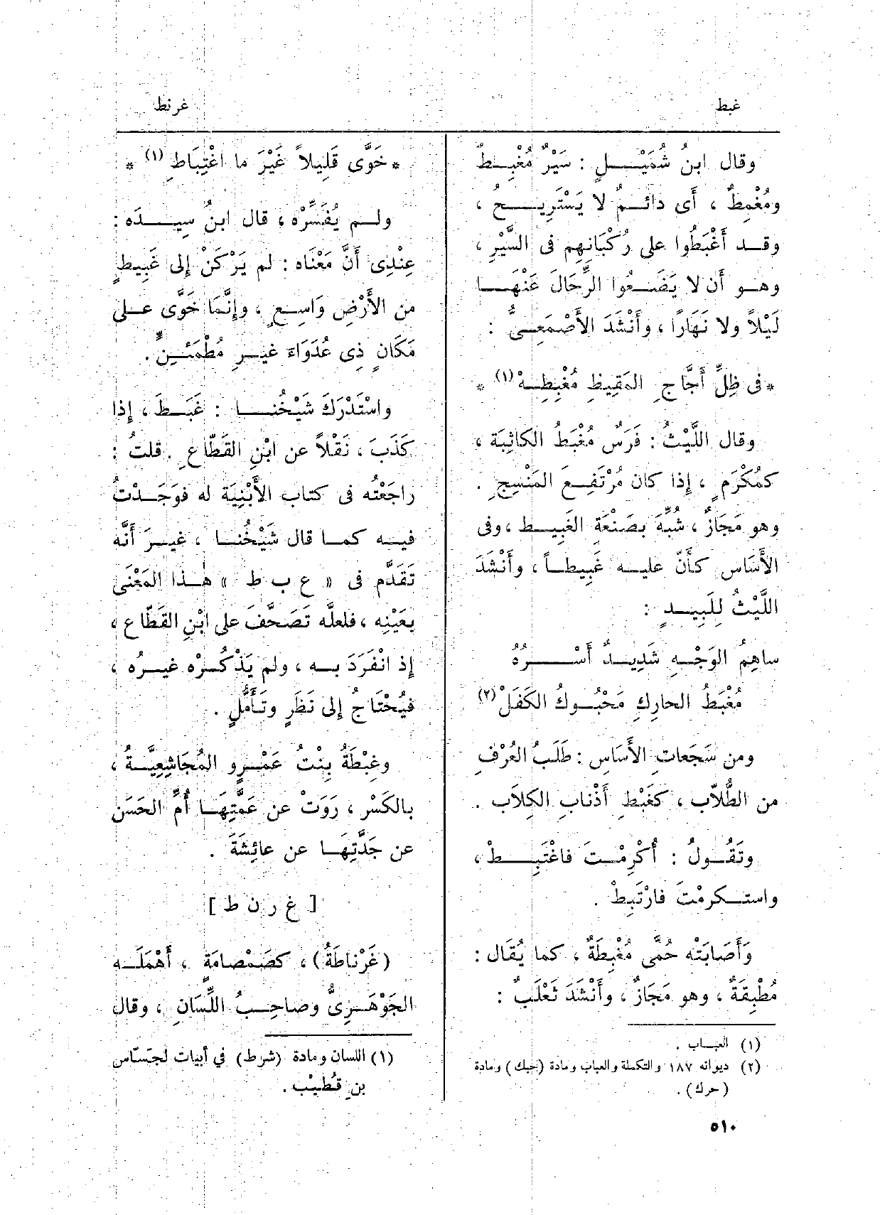 قلتُ: راجَعْتُه فِي كتاب الأَبنِيَة لَهُ فوجدْتُ فِيهِ كَمَا قَالَ شيخُنا، غيرَ أَنَّه تقدَّمَ فِي ع ب ط هَذَا الْمَعْنى بعَيْنِه، فلعلَّه تَصَحَّفَ على ابنِ القطَّاعِ، إِذ انْفَرَدَ بِهِ، وَلم يَذْكُرْه غيرُه، فيُحْتاجُ إِلى نَظَرٍ وتَأَمُّلٍ. وغِبْطَةُ بِنْتُ عَمْرٍ والمُجاشِعِيَّةُ، بالكَسْرِ، رَوَتْ عَن عمَّتِها أُمُّ الحَسَن عَن جدَّتِها عَن عائِشَةَ.