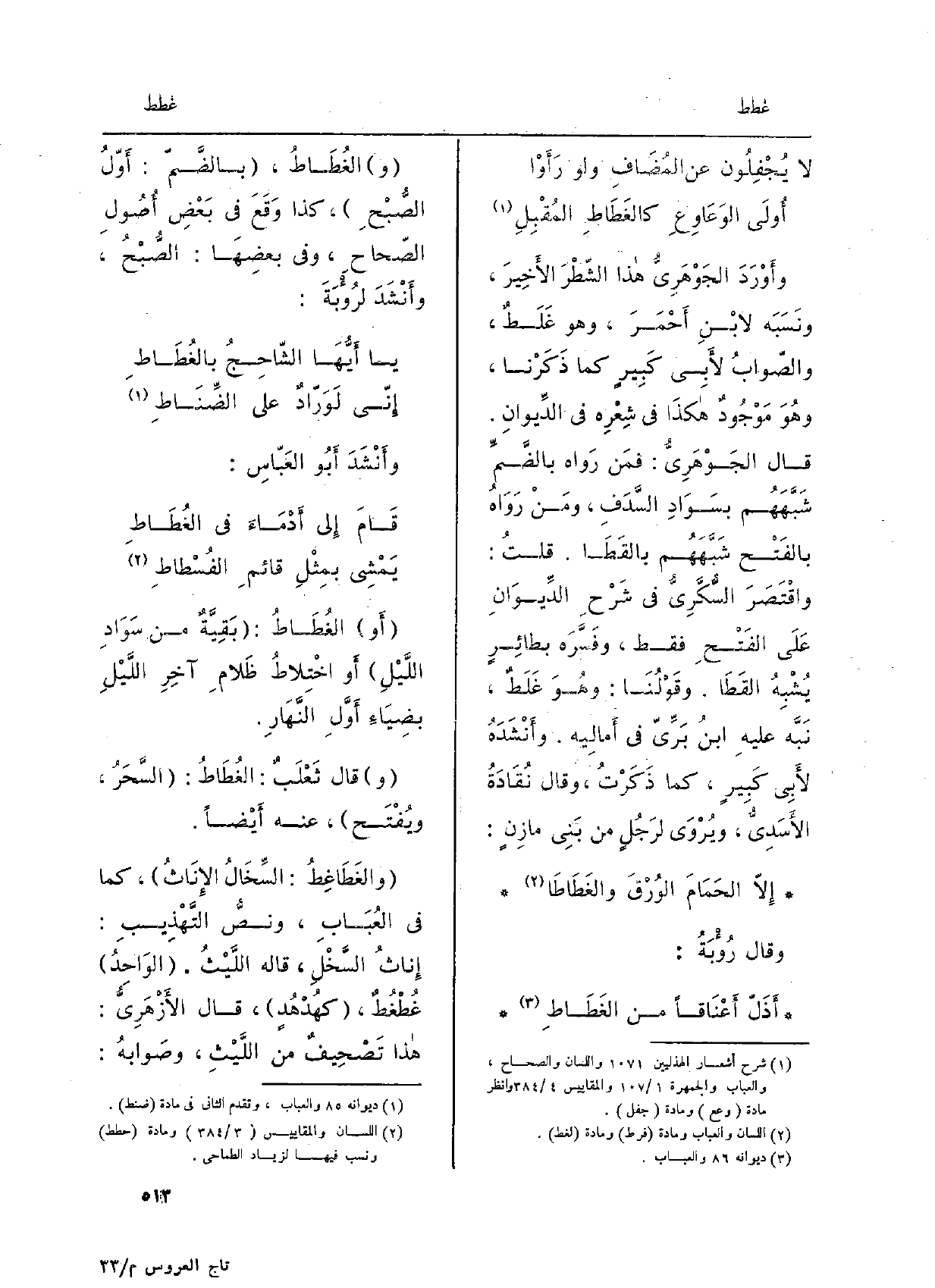 السَّدَفِ، ومَنْ رَواهُ بالفَتْح شَبَّهَهُم بالقَطَا. قلتُ: واقْتَصَرَ السُّكَّرِيُّ فِي شَرْحِ الدِّيوانِ على الفَتْحِ فَقَط، وفسَّرَه بطائِرٍ يُشْبِهُ القَطَا. وقولُنا: وَهُوَ غَلَطٌ، نَبَّه عليهِ ابنُ بَرِّيّ فِي أَماليه. وأَنْشَدَهُ لأَبي كَبيرٍ، كَمَا ذَكَرْتُ، وَقَالَ نُقَادَةُ الأَسَدِيُّ، ويُروى لرَجُلٍ من بَني مازِنٍ: إلاَّ الحَمَامَ الوُرْقَ} والغَطَاطَا وَقَالَ رُؤْبَةُ: أَذَلَّ أَعْنَاقاً من {الغَطَاطِ و} الغُطَاطُ، بالضَّمِّ: أَوَّلُ الصُّبْحِ، كَذَا وَقَعَ فِي بعضِ أُصُولِ الصّحاح، وَفِي بعضِها: الصُّبْحُ، وأَنْشَدَ لرُؤْبَةَ: يَا أَيُّها الشَّاحِجُ {بالغُطَاطِ إِنِّي لوَرَّادٌ على الضِّنَاطِ وأَنْشَدَ أَبو العَبَّاسِ: قَامَ إِلى أَدْماءَ فِي الغُطَاطِ يَمْشي بمِثْلِ قائِمِ الفُسْطاطِ أَو الغُطَاطُ: بَقيَّةٌ من سَوادِ اللَّيْلِ أَو اخْتِلاطُ ظَلامِ آخِرِ اللَّيْلِ بضِياءِ أَوَّلِ النَّهارِ. وَقَالَ تَعْلَبٌ: الغُطَاطُ: السَّحَرُ، ويُفْتَح، عَنهُ أَيْضاً.} والغَطَاغِطُ: السِّخَالُ الإِناثُ، كَمَا فِي العُباب، ونصُّ التَّهْذيبِ: إِناثُ السَّخْلِ، قَالَه اللَّيْثُ. الواحِدُ! غُطْغُطٌ، كهُدْهُدٍ، قَالَ الأَزْهَرِيّ: هَذَا تَصْحيفٌ من اللَّيْثِ، وصَوابُه: