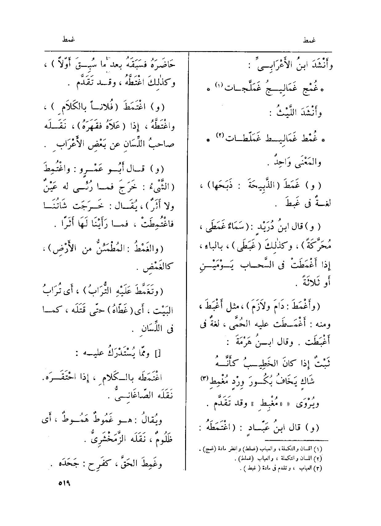 وأَنْشَدَ ابنُ الأَعْرابيِّ: غُمْج غَمَالِيجُ غَمَلَّجات وأَنْشَدَ اللَّيْثُ: غُمْط غَمَالِيط غَمَلَّطات والمَعْنَى واحِدٌ. وغَمَطَ الذَّبيحَةَ: ذَبَحَها، لغةٌ فِي غَمَطَ. وقالَ ابنُ دُرَيْدٍ: سَماءٌ غَمَطَى، محرَّكةً، وكذلكَ غَبَطَى، بالباءِ، إِذا أَغْمَطَتْ فِي السَّحاب يَوْمَيْنِ أَو ثلاثَةً. وأَغْمَطَ: دامَ ولازَمَ، مثل أَغْبَطَ، وَمِنْه: أَغْمَطَت عَلَيْهِ الحُمَّى، لغةٌ فِي أَغْبَطَت. وَقَالَ ابنُ هَرْمَةَ: