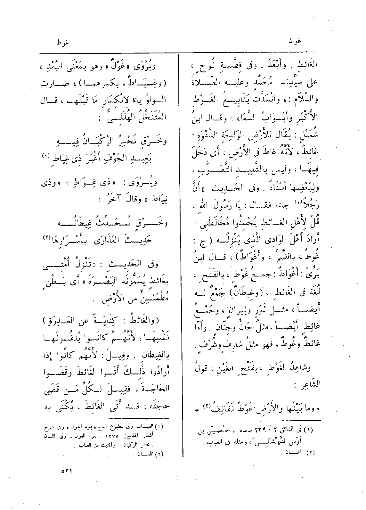 {الغَائِطِ وأَبْعَدُ. وَفِي قِصَّةِ نُوحٍ، على سيِّدِنا محمَّدٍ وَعَلِيهِ الصَّلاةُ والسَّلام: وانْسَدَّت يَنابيعُ الغَوْطِ الأَكْبَرِ وأَبْوابُ السَّماءِ وَقَالَ ابنُ شُمَيْلٍ: يُقَال للأرْضِ الواسِعَةِ الدَّعْوَةِ: غائِطٌ، لأَنَّه غاطَ فِي الأَرْضِ، أَي دَخَلَ فِيهَا، وَلَيْسَ بالشَّديدِ التَّصَوُّبِ، ولبَعْضِها أَسْنادٌ. وَفِي الحديثِ: أَنَّ رجلا جاءَ فَقَالَ: يَا رَسُولَ اللهِ، قُلْ لأَهْلِ} الغائطِ يُحْسِنوا مُخَالَطَتي أَرادَ أَهْلَ الْوَادي الَّذي يَنْزِلُه، ج: {غُوطٌ، بالضَّمِّ،} وأَغْواطٌ، قَالَ ابنُ بَرِّيّ: {أَغْواطٌ: جمعُ} غَوْطٍ، بالفَتْحِ، لُغَةٌ فِي {الغائطِ،} وغِيطَانٌ جمعٌ لَهُ أَيضاً، مثل ثَوْرٍ وثِيرانٍ، وجمعُ {غائِطٍ أَيْضا، مثلُ جَانٍّ وجِنّانٍ. وأَمَّا غائطٌ} وغُوطٌ، فَهُوَ مثلُ شارِفٍ وشُرْفٍ. وشاهِدُ الغَوْطِ، بفَتْحِ الغَيْنِ، قولُ الشَّاعِر: وَمَا بَيْنَها والأَرْضِ {غَوْطٌ نَفَانِفُ ويُروى غَوْلٌ وَهُوَ بِمَعْنى البُعْدِ،} وغِيَاطٌ، بكسرِهما، صَارَت الواوُ يَاء لانْكِسارِ مَا قبلَها، قَالَ المُتَنَخِّلُ الهُذَلِيُّ: