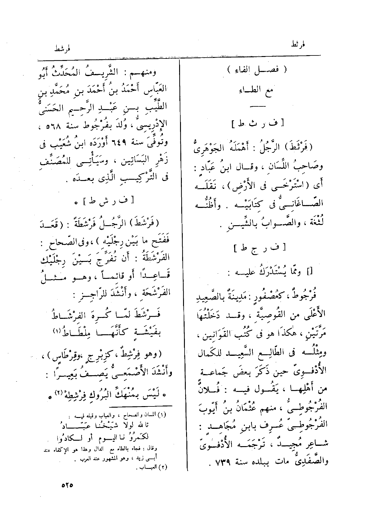وممَّا يُسْتَدْرَكُ عَلَيْه: فُرْجُوطٌ، كعُصْفُورٍ: مدينَةٌ بالصَّعِيدِ الأَعلى من القُوصِيَّةِ، وَقد دَخَلْتُها مرَّتَيْنِ، هَكَذَا هُوَ فِي كُتُب القَوَانين، ومِثْلُه فِي الطَّالع السَّعيد للكَمال الأُدْفوِيّ حِين ذَكَرَ بعضَ جَماعةٍ من أَهْلِها، يقولُ فِيهِ: فُلانٌ الفُرْجُوطِيُّ، مِنْهُم عُثْمانَ بنُ أَيُّوبَ الفُرْجُوطِيُّ عُرِف بابنِ مُجَاهِدٍ: شاعرٌ مُجيدٌ، تَرْجَمَهُ الأُدْفويّ والصَّفَدِيُّ مَاتَ سنة. وَمِنْهُم: الشَّريفُ المُحَدِّثُ أَبو العبَّاسِ أَحمدُ بنُ أَحمدَ بنِ محمَّدِ بنِ الطَّيِّبِ بنِ عبدِ الرَّحيم الحَسَنِيُّ الإِدْريسِيُّ، وُلِدَ بفُرْجُوط سنة، وتوفِّيَ سنة أَوْرَدَه ابنُ شُعَيْبٍ فِي زَهْرِ البَساتين، وسَيَأْتي للمصنِّفِ فِي التَّرْكيبِ الَّذي بعده.