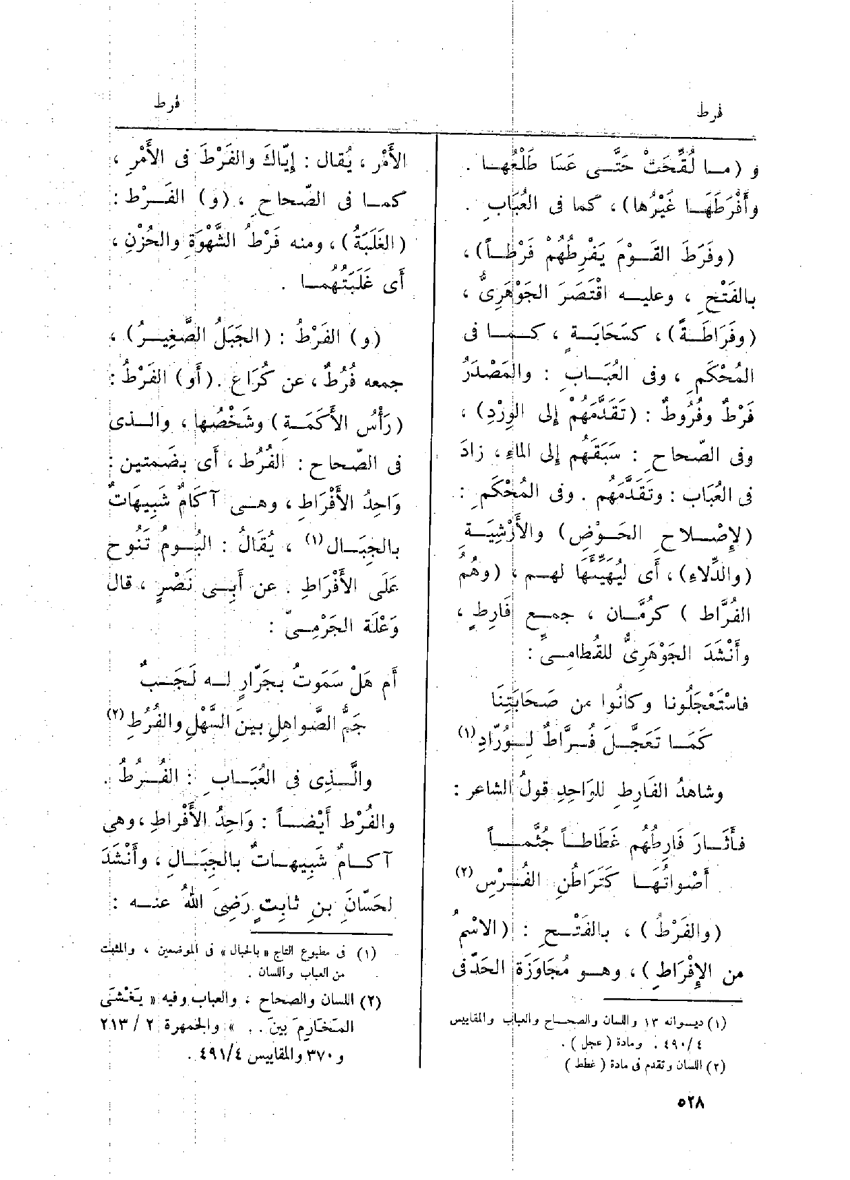 والَّذي فِي العُبَاب: الفُرُطُ. والفُرْطُ أَيْضاً: واحِدُ الأَفْراطِ، وَهِي آكامٌ شَبيهاتٌ بالجِبالِ، وأَنْشَدَ لحَسَّان بنِ ثابِتٍ رَضِيَ اللهُ عَنهُ: