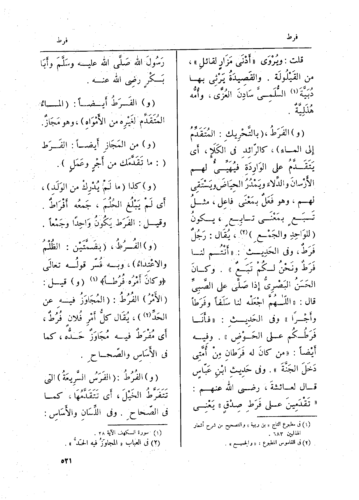 قلت: ويُرْوَى: أَدْنَى مَزَارٍ لقائلِ، من القَيْلُولَة. والقَصيدَةُ يَرْثي بهَا دُبَيَّةَ السُّلَمِيَّ سَادِنَ العُزَّى، وأُمُّه هُذَلِيَّةٌ. والفَرَطُ، بالتَّحريكِ: المُتَقَدِّمُ إِلى الماءِ، كالرَّائِدِ فِي الكَلإِ، أَي يَتَقَدَّمُ على الوارِدَةِ فيُهَيِّئُ لَهُم الأَرْسانَ والدِّلاءَ ويَمْدُرُ الحِياضَ ويَسْتَقِي لَهُم، وَهُوَ فَعَلٌ بِمَعْنى فاعِل، مثلُ تَبَعٍ بِمَعْنى تابِعٍ، يكون للواحِدِ والجَمْعِ، يُقَال: رجُلٌ فَرَطٌ، وَفِي الحَديثِ: أَنْتُم لنا فَرَطٌ ونَحْنُ لكُمْ) تَبَعٌ وكانَ الحَسَنُ البَصْرِيُّ إِذا صلَّى على الصَّبِيِّ قَالَ: اللَّهُمَّ اجْعَلْه لنا سَلَفاً وفَرَطاً وأَجْراً وَفِي الحديثِ: فأَنَا فَرَطُكُم على الحَوْضِ. وَفِيه أَيْضاً: من كانَ لَهُ فَرَطَانِ مِنْ أُمَّتِي دَخَلَ الجَنَّةَ. وَفِي حديثِ ابنِ عبَّاسٍ قَالَ لعائِشَةَ، رضيَ اللهُ عَنْهُم: تَقْدَمِينَ على فَرَطِ صِدْقٍ يَعْنِي رَسولَ الله صلَّى الله عَلَيْهِ وسلَّمَ وأَبا بكرٍ رضيَ الله عَنهُ. والفَرَطُ أَيْضاً: الماءُ المُتَقَدِّمُ لغيرِه من الأَمْواهِ، وَهُوَ مَجازٌ. وَمن المَجاز أَيْضاً: الفَرَطُ: مَا تَقَدَّمَكَ من أَجْرٍ وعَمَلٍ. وَكَذَا مَا لم يُدْرِكْ من الوَلَدِ، أَي لم يَبْلُغ الحُلُمَ، جمعُه أَفْراطٌ. وقِيل: الفَرَطُ يكونُ واحِداً وجَمْعاً. والفُرُطُ، بضمَّتين: الظُلْمُ والاعْتِداءُ، وَبِه فُسِّر قولُه تَعَالَى وكانَ أَمْرُهُ فُرُطا وقِيل: الأَمْرُ الفُرُطُ: المُجاوَزُ فِيهِ عَن الحَدِّ، يُقَال كلُّ أَمْرِ فُلانٍ فُرُطٌ، أَي مُفْرَطٌ فِيهِ مُجاوزٌ حَدُّه، كَمَا فِي الأَساس والصّحاح.