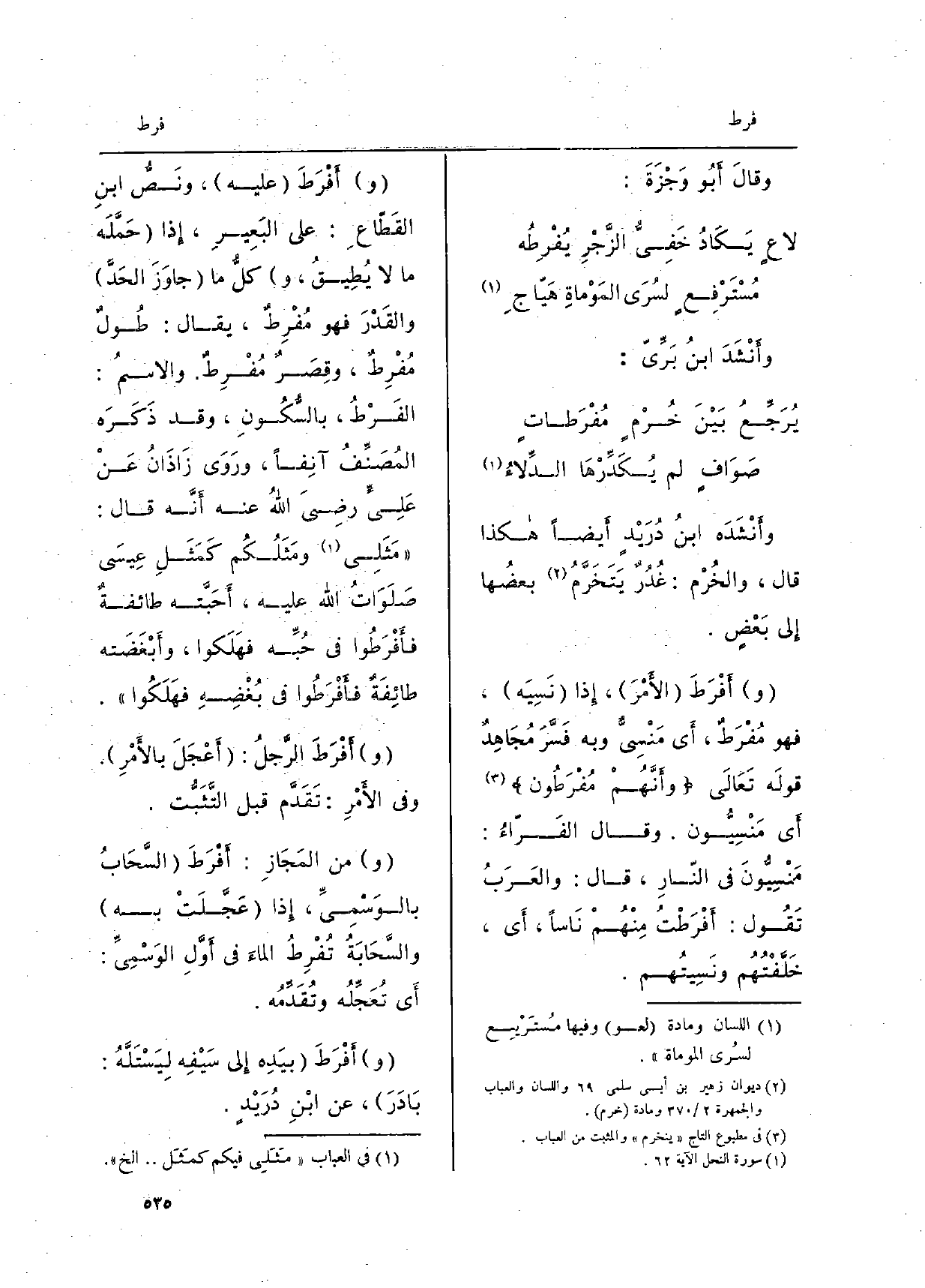 وأَنْشَدَه ابنُ دُرَيْدٍ أَيْضاً هَكَذَا قَالَ: والخُرْم: غُدُرٌ يَتَخَرَّمُ بعضُها إِلى بعضٍ. وأَفْرَطَ الأَمْرَ، إِذا نَسِيَه، فَهُوَ مُفْرَطٌ، أَي مَنْسِيٌّ وَبِه فَسَّرَ مُجاهِدٌ قَوْله تعالَى: وأَنَّهُمْ مُفْرَطُون أَي مَنْسِيُّون. وَقَالَ الفرَّاءُ: مَنْسِيُّونَ فِي النَّارِ، قَالَ: والعَرَبُ تَقولُ: أَفْرَطْتُ مِنْهُم نَاساً، أَي خلَّفْتُهُم ونَسيتُهم. وأَفْرَطَ عَلَيْهِ، ونَصُّ ابنِ القطَّاعِ: على البَعيرِ، إِذا حمَّلَه مَا لَا يُطيقُ، وكلُّ مَا جاوَزَ الحَدَّ والقَدْرَ فَهُوَ مُفْرِطٌ، يُقال: طُولٌ مُفْرِطٌ، وقِصَرٌ مُفْرِطٌ. والاسمُ: الفَرْطُ، بالسُّكونِ، وَقد ذَكَرَه المُصَنِّف آنِفاً، وروَى زاذَانُ عَن عليٍّ رَضِي الله عَنهُ أَنَّه قَالَ: مَثَلِي ومَثَلُكُم كمَثَلِ عِيسَى صَلَواتُ الله عَلَيْهِ، أحَبَّته طائفةٌ فأَفْرَطُوا فِي حُبِّه فهَلَكوا، وأَبْغَضَته طائفةٌ فأَفْرَطُوا فِي بُغْضِه فهَلَكُوا. وأَفْرَطَ الرَّجُلُ: أَعْجَلَ بالأَمْرِ. وَفِي الأَمْرِ: تَقَدَّم قبل التَّثَبُّت. وَمن المَجازِ: أَفْرَطَ السَّحَابُ بالوَسْمِيِّ، إِذا عجَّلَتْ بِهِ، والسَّحَابَةُ تُفْرِطُ الماءَ فِي أَوَّلِ الوَسْمِيِّ: أَي تُعَجِّلُه وتُقَدِّمُه. وأَفْرَطَ بيَدِه إِلى سَيْفِه ليَسْتَلَّهُ: بادَرَ، عَن ابنِ دُرَيْدٍ.