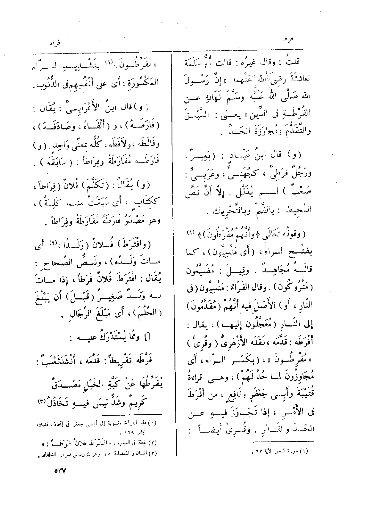 إلاَّ أَنَّ نصَّ المُحيطِ: بالضَّمِّ وبالتَّحريكِ. وقولُه تعالَى: وأَنَّهُمْ مُفْرَطُونَ بفتْح الرَّاءِ، أَي مَنْسِيُّون، كَمَا قالَهُ مُجاهِدٌ. وَقيل: مُضَيَّعون مُتْروكون. وَقَالَ الفرَّاءُ: منْسِيُّون فِي النَّارِ، أَو الأَصْلُ فِيهِ أَنَّهم مُقَدَّمونَ إِلى النَّارِ مُعَجَّلونَ إليْها، ويُقال: أَفْرَطَه: قدَّمَهُ، نَقَلَهُ الأَزْهَرِيّ. وقُرِئَ: مُفْرِطونَ بكسرِ الرَّاءِ، أَي مُجاوِزونَ لما حُدَّ لهُمْ، وَهِي قراءةُ قُتَيْبَةَ وأَبي جعفَرٍ ونافِعٍ، من أَفْرَطَ فِي الأَمْرِ، إِذا تَجاوَزَ فِيهِ عَن الحَدِّ والقَدْرِ. وقُرِئَ أَيْضاً: مُفَرِّطُونَ بتَشْديدِ الرَّاءِ المَكْسُورَةِ، أَي على أَنْفُسِهِم فِي الذُّنُوبِ. وَقَالَ ابنُ الأَعرابيِّ: يُقال: فارَطَهُ، وأَلْفاهُ، وصادَفَهُ، وفالَطَهُ، ولافَطَهُ، كلُّهُ بِمَعْنى واحدٍ. وفارَطَهُ مُفارَطَةً وفِراطاً: سابَقَهُ. ويُقال: تكَلَّمَ فُلانٌ فِراطاً، ككِتابٍ، أَي سَبَقَتْ مِنْهُ كَلِمَةٌ، وَهُوَ مصْدَرُ فارَطَهُ مُفارَطَةً وفِراطاً. وافْتَرَطَ فُلانٌ وَلَداً، أَي ماتَ وَلَدُه، ونصُّ الصّحاح: يُقال: افْتَرَطَ فُلانٌ فَرَطاً، إِذا ماتَ لهُ وَلَدٌ صَغيرٌ قَبْلَ أَن يَبْلُغَ الحُلُمَ، أَي مَبْلَغَ الرِّجالِ. وممَّا يُسْتَدْرَكُ عَلَيْهِ: فَرَّطَه تَفْرِيطاً: قَدَّمَه، وأَنْشَدَ ثَعْلَبٌ: