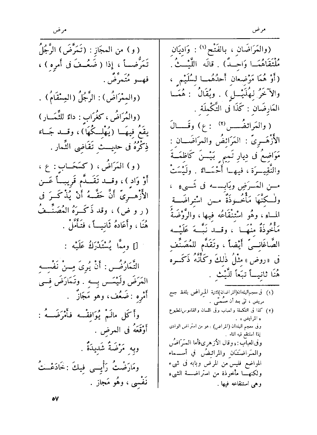 والمَرَاضَانِ، بالفَتْحِ: وادِيانِ مُلْتقاهُما واحِدٌ. قالَهُ اللَّيْثُ. أَو هُما مَوْضِعانِ أَحدهُما لسُلَيْمٍ، والآخَرُ لهُذَيْلٍ. ويُقَالُ: هُما المَارِضانِ: كَذَا فِي التَّكْمِلَة. والمَرائضُ: ع وَقَالَ الأّزْهَرِيّ: المَرائضُ والمَراضانِ: مَواضِعُ فِي ديارِ تَميمٍ بيم كاظِمَةَ والنَّقِيرَة، فِيهَا أَحْساءٌ.)