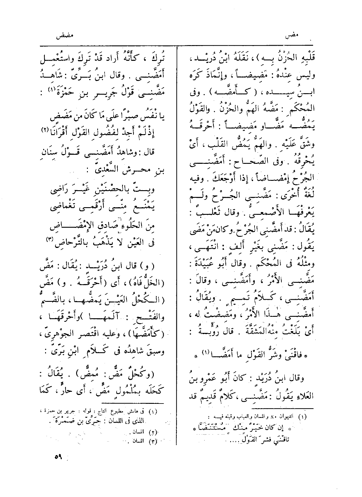 وَقَالَ ثَعْلَبٌ: يُقَالُ: قَدْ أَمَضَّني الجرحُ. وكانَ مَنْ مَضَى يَقُولُ: {- مَضَّني بغيرِ أَلِفٍ. انْتَهَى، وَمثله فِي المُحكم. وَقَالَ أَبو عُبَيْدَةَ: مَضَّني الأَمْرُ،} - وأَمَضَّني، وَقَالَ: أَمَضَّنِي، كلامُ تَميمٍ. ويُقَالُ: أَمَضَّني هَذَا الأَمْرُ، {ومَضِضْتُ لهُ، أَي بَلَغْتُ مِنْهُ المَشَقَّةَ. قالَ رُؤْبَةُ: فاقْنَيْ وشَرُّ القَوْلِ مَا} أَمَضَّا وَقَالَ أَبنُ دُرَيْدٍ: كانَ أَبو عَمْرو بنُ العلاءِ يَقُولُ: مَضَّني، كلامٌ قديمٌ قَدْ تُرِكَ، كأَنَّهُ أَرادَ قَدْ تركَ واسْتُعْمِل أَمَضَّني. وَقَالَ ابنُ بَرِّيّ: شاهِدُ مَضَّني قَوْلُ جَريرٍ بنِ حمزَةَ: