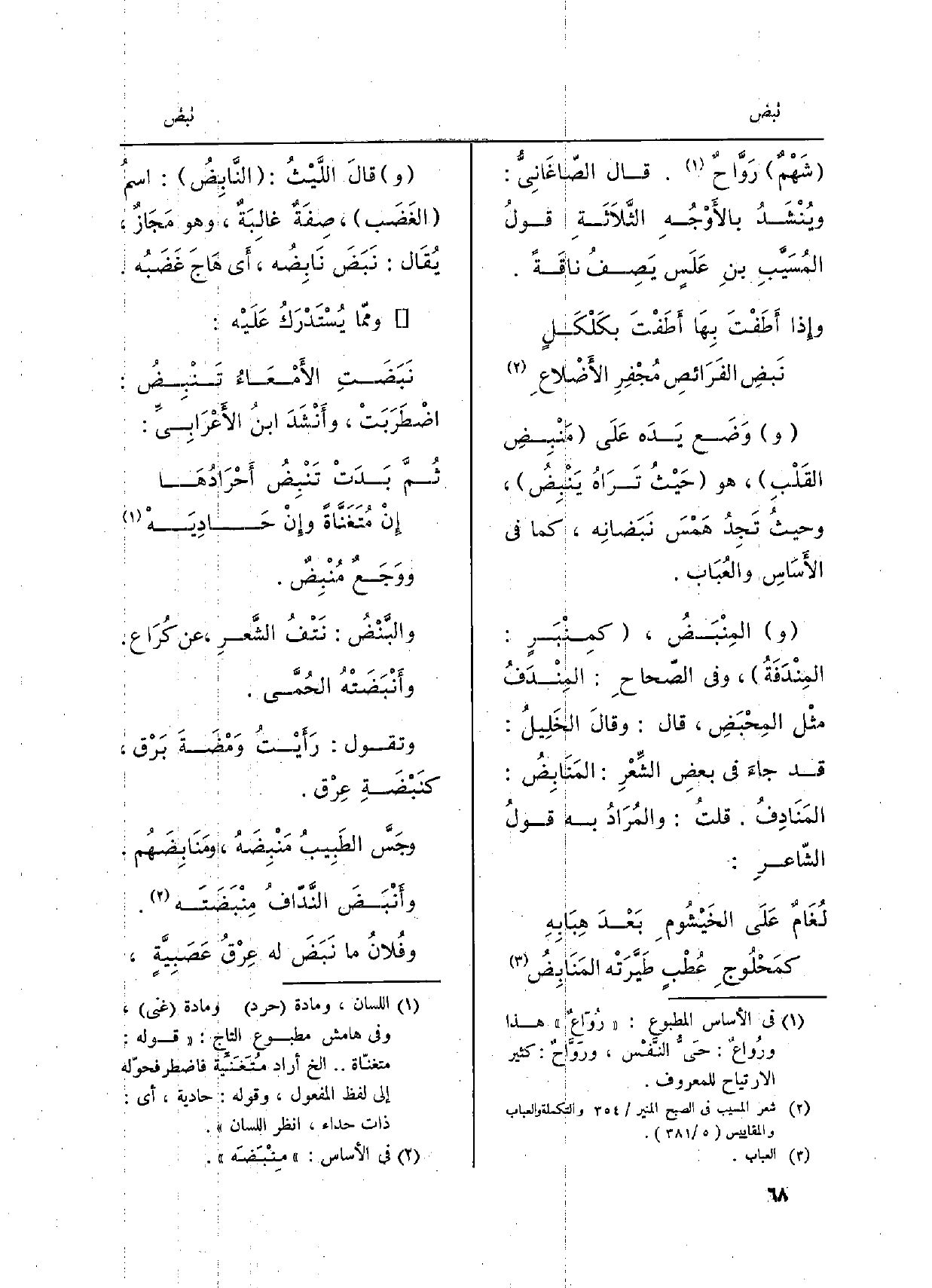 وَقَالَ اللَّيْثُ: النَّابِضُ: اسمُ الغَضَب، صفَةٌ غالبةٌ، وهُو مَجَازٌ، يُقَالُ: نَبَضَ نابَضُه، أَي هاجَ غَضَبُه. وممَّا يُسْتَدْرَكُ عَلَيْه: نَبَضَتِ الأَمعاءُ تَنْبِضُ: اضْطَرَبَتْ، وأَنْشَدَ ابنُ الأَعْرَابيّ: