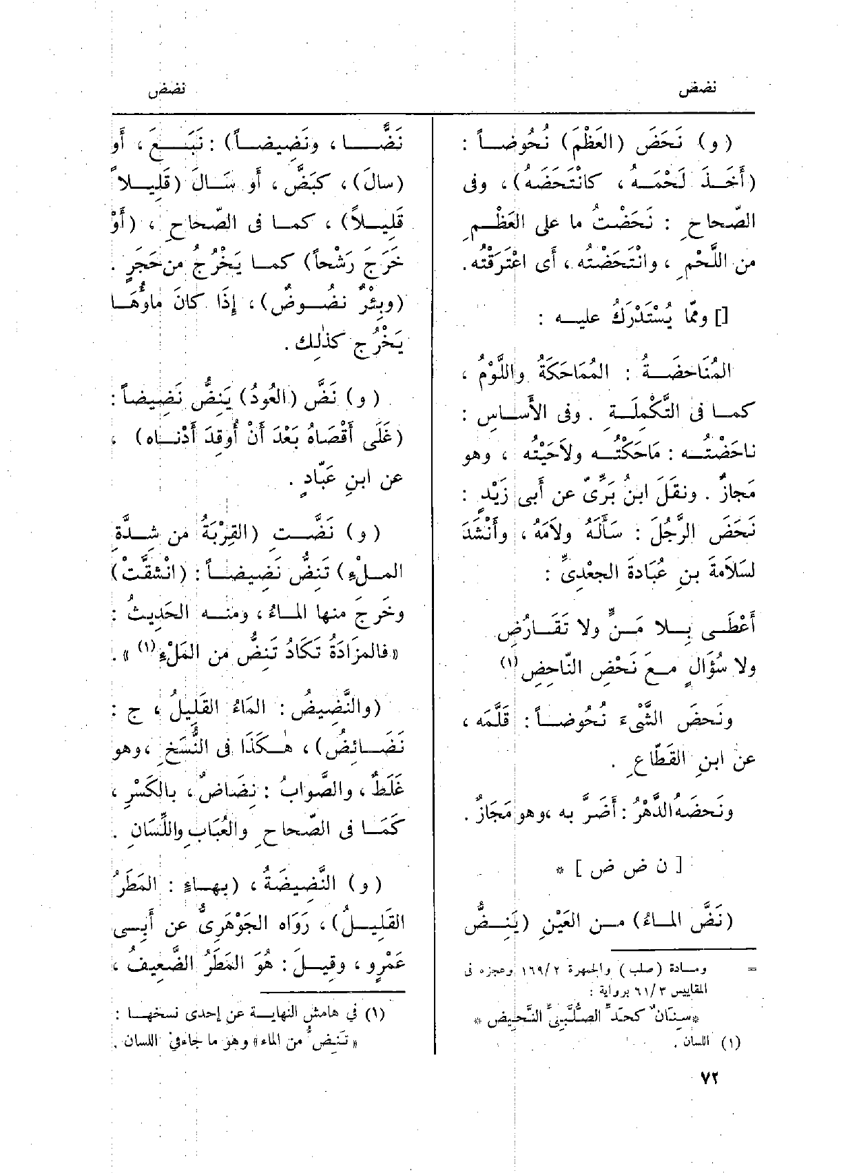 التَّكْمِلَة. وَفِي الأَساسِ: ناحَضْتُه: ماحَكْتُه ولاحَيْتُه، وهُو مَجَازٌ. ونقلَ ابنُ بَرِّيّ عَن أَبي زَيْدٍ: نَحَضَ الرَّجُلَ: سأَلَهُ ولامَهُ، وأَنْشَدَ لسَلامَةَ بنِ عُبادَةَ الجعْدِيّ: أَعْطَى بِلا مَنٍّ وَلَا تَقَارُضِ وَلَا سُؤَالٍ معَ نَحْضِ النَّاحِضِ ونَحَضَ الشَّيْءَ نُحُوضاً: قلَّمَه، عَن ابنِ القَطَّاع. ونَحَضَهُ الدَّهْرُ: أُضرَّ بِهِ، وهُو مَجَازٌ.