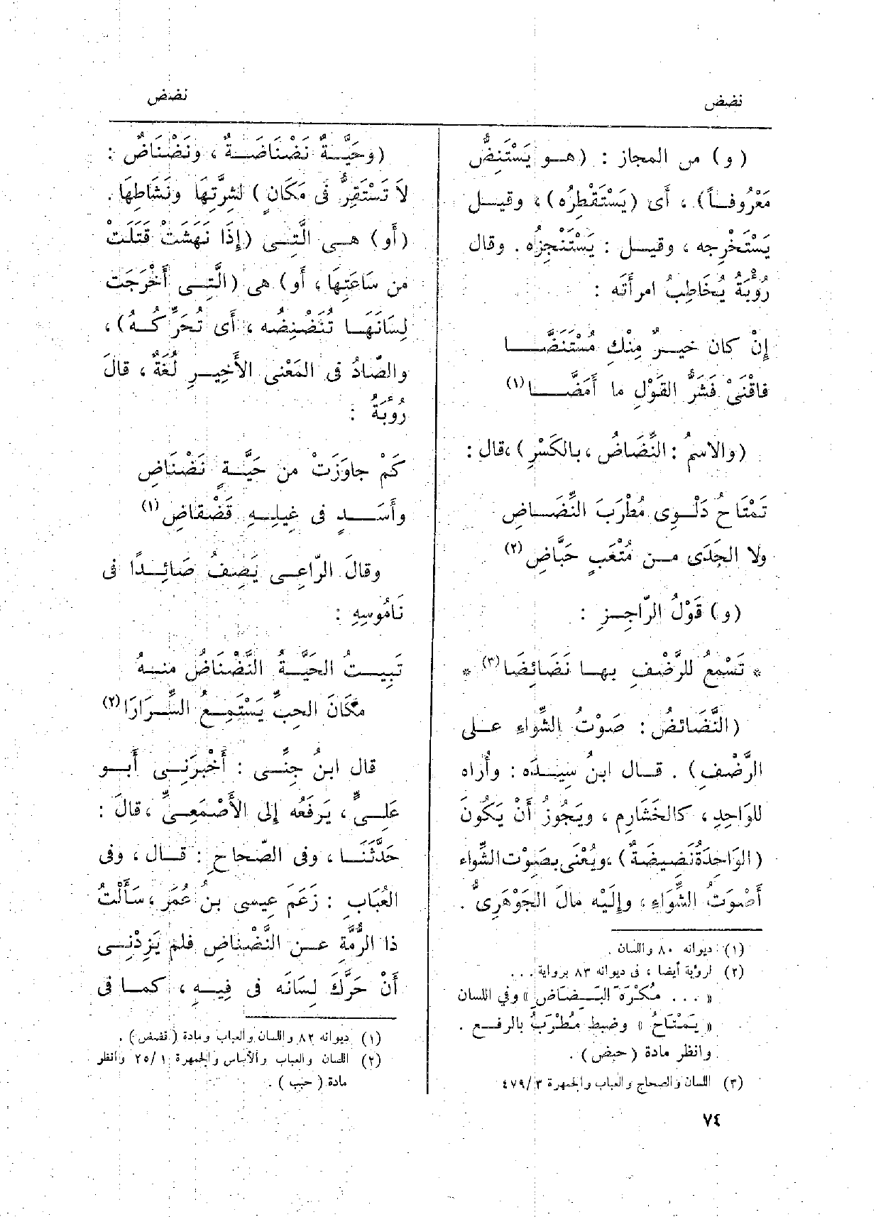 وَمن المَجَازِ: هُوَ {يَسْتَنِضُّ مَعْروفاً، أَي يَسْتَقْطِرُه، وَقيل يَسْتَخْرِجُه، وَقيل: يستَنْجِزُه. وَقَالَ رُؤْبَةُ يُخاطِبُ امرأَتَه: إِنْ كانَ خيرٌ مِنْكِ} مُسْتَنَضَّا فاقْنَيْ فَشَرُّ القَوْلِ مَا أَمَضَّا والاسمُ: {النِّضاضُ، بالكَسْرِ، قالَ: تَمْتَاحُ دَلْوِي مُطْرَبَ النِّضَاضِ وَلَا الجَدَى مِنْ مُتْعَبٍ حَبَّاضِ وقولُ الرَّاجِزِ: تَسمَعُ للرَّضْفِ بهَا} نَضَائِضَا {النَّضائِضُ: صوتُ الشِّواءِ عَلَى الرَّضْفِ. قالَ ابنُ سِيدَه: وأُراه للواحِدِ، كالخَشارِم، ويجوزُ أَنْ يكونَ الواحدَةُ} نَضيضَةٌ، ويُعْنى بصوتِ الشِّواءِ أَصْواتُ الشِّواءِ، وإليهِ مالَ الجَوْهَرِيّ. وحَيَّةٌ {نَضْناضَةٌ،} ونَضْناضٌ: لَا تستقِرُّ فِي مكانٍ لشِرَّتِها ونَشاطِها. أَو هِيَ الَّتِي إِذا نَهَشَتْ قَتَلَتْ من ساعَتِها، أَو هِيَ الَّتِي أَخْرَجَتْ لِسانَها {تُنَضْنِضُه، أَي تُحرِّكُهُ، والصَّادُ فِي المَعْنى الأَخيرِ لغةٌ، قالَ رُؤْبَةُ: كَمْ جاوَزَتْ مِنْ حَيَّةٍ} نَضْناضِ وأَسَدٍ فِي غِيلِهِ قَضْقاضِ وَقَالَ الرَّاعي يَصِفُ صَائداً فِي نامُوسِهِ: تَبيتُ الحَيَّةُ! النَّضْناضُ مِنْهُ مَكَانَ الحِبِّ يَسْتَمِعُ السِّرَارَا قالَ ابنُ جِنِّي: أَخْبَرَني أَبو عليٍّ، يَرفَعُه إِلَى الأَصْمَعِيّ، قالَ: حدَّثنا، وَفِي الصّحاح: قالَ، وَفِي العُبَاب: زَعَمَ عِيسَى بنُ عُمَر، سأَلْتُ ذَا الرُّمَّةِ عَن النَّضْناضِ فَلم يَزِدْني أَنْ حرَّكَ لِسانَهُ فِي فِيه، كَمَا فِي