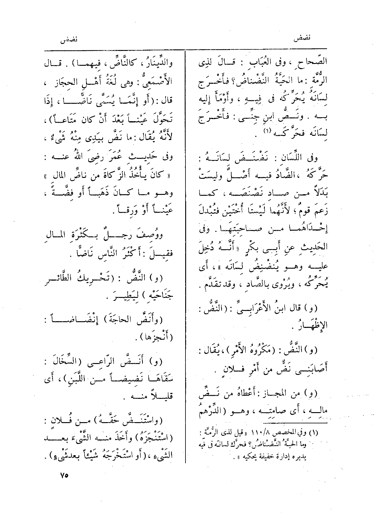 حرَّكَهُ، الضَّادُ فِيهِ أَصلٌ وليسَتْ بَدَلاً من صادِ نَصْنَصَهُ، كَمَا زَعَمَ قومٌ، لأَنَّهُما ليْسَتا أُخْتَيْن فتُبْدلُ إِحداهُما من صاحِبَتِها. وَفِي الحديثِ عَن أَبي بكرٍ أَنَّهُ دُخِلَ عَلَيْهِ وَهُوَ} يُنَضْنِضُ لِسانَه، أَي يُحرِّكُه، ويُروى بالصَّادِ، وَقَدْ تَقَدَّم. وَقَالَ ابنُ الأَعْرَابيّ: و {النَّضُّ: الإِظْهارُ. والنَّضُّ: مَكروهُ الأَمْرِ، يُقَالُ: أَصابَني نَضٌّ من أَمرِ فلانٍ. وَمن المَجَازِ: أَعطاهُ من} نَضِّ مالِهِ، أَي صامِتِه، وَهُوَ الدِّرْهمُ والدِّينارُ، {كالنَّاضِّ، فيهمَا. قالَ الأَصْمَعِيّ: وَهِي لغةُ أَهلِ الحِجازِ، قالَ: أَو إنَّما يُسمَّى} نَاضًّا، إِذا تحوَّلَ عَيْناً بعدَ أَنْ كانَ مَتَاعاً، لأَنَّهُ يُقَالُ: مَا نَضَّ بيَدي مِنْهُ شيءٌ، وَفِي حديثِ عُمَرَ رَضِيَ الله عَنْه: كانَ يأْخُذُ الزَّكاةَ من {ناضِّ المالِ وَهُوَ مَا كانَ ذَهَباً أَو فِضَّةً، عَيْناً أَو وَرِقاً.