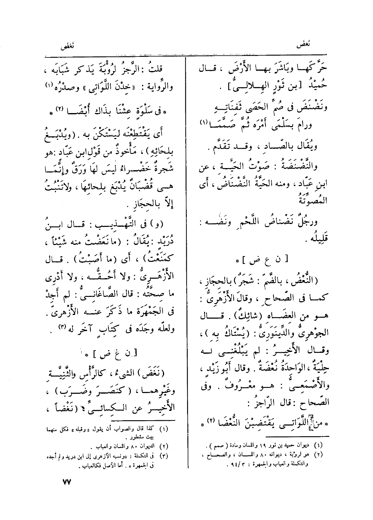 النُّعْضُ، بالضَّمِّ: شَجَرٌ بالحِجازِ، كَمَا فِي الصّحاح، وقالَ الأّزْهَرِيّ: هُوَ من العِضاهِ شائِكٌ. قالَ الجَوْهَرِيّ والدِّينَوَرِيُّ: يُسْتاكُ بِهِ، وَقَالَ الأَخيرُ: لم يَبْلُغْني لَهُ حِلْيَةٌ، الواحِدَةُ نُعْضَةٌ. وَقَالَ أَبو زَيْدٍ، والأَصْمَعِيّ: هُوَ معْروفٌ. وَفِي الصّحاح: قالَ الرَّاجِزُ: من اللَّوَاتي يَقْتَضِبْنَ النُّعْضَا قُلْتُ: الرَّجزُ لرُؤْبَةَ يذكر شَبابَهُ، والرِّواية: خِدْنَ اللَّواتي وصدْرُه: فِي سَلْوَةٍ عِشْنا بذَاكَ أُبْضَا أَي يَقْتَطِعْنَهُ ليَسْتَكْنَ بِهِ. ويُدْبَغُ بلِحائِهِ، مأْخوذٌ من قَوْلِ ابنِ عبَّادٍ: هُوَ شَجرةٌ خَضْراءُ لَيْسَ لَهَا وَرَقٌ وإِنَّما هِيَ قُضْبانٌ يُدْبَغُ بلِحائِها، وَلَا تَنْبُتُ إلاَّ بالحِجازِ. وَفِي التَّهذيب: قالَ ابنُ دُرَيْدٍ: يُقَالُ: مَا نَعَضْتُ مِنْهُ شَيْئا، كمَنَعْتُ، أَي مَا أَصَبْتُ. قالَ الأّزْهَرِيّ: وَلَا أَحُقُّه، وَلَا أَدري مَا صِحَّتُه. قالَ الصَّاغَانِيُّ: لم أَجدْ فِي الجَمْهَرَة مَا ذَكَرَ عَنهُ الأّزْهَرِيّ. ولعلَّه وَجَدَهُ فِي كِتابٍ آخَر لَهُ.