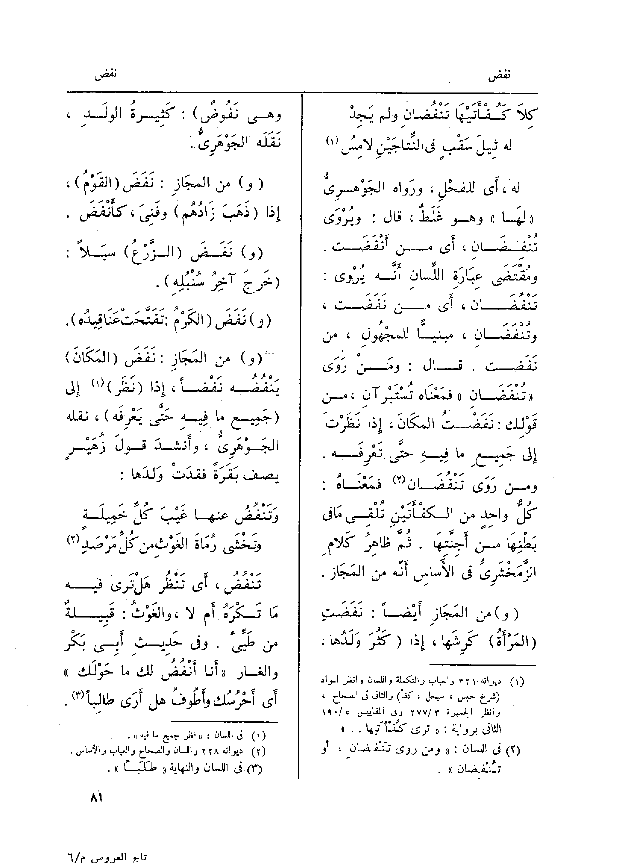 ومُقتَضَى عِبَارَة اللّسَان أَنَّهُ يُروى: تَنْفُضان، أَي من نَفَضَت، وتُنْفَضَانِ، مبنيًّا للمجهولِ، من نَفَضت. ومَن روى تُنْفَضَانِ، فَمَعْنَاه تُسْتَبْرآنِ، من قولِك: نَفَضْتُ المكانَ، إِذا نظرتَ إِلَى جميعِ مَا فِيهِ حتَّى تَعْرِفُه. وَمن روَى تَنْفُضانِ فمعناهُ: كلُّ واحدٍ من الكَفْأَتَيْنِ تُلْقِي مَا فِي بطنِها من أَجِنَّتِها. ثمَّ ظاهرُ كلامِ الزَّمَخْشَرِيُّ فِي الأَساسِ أَنَّهُ من المَجَاز. وَمن المَجَازِ أَيْضاً: نَفَضَتِ المرأَةُ كَرِشَها، إِذا كثُرَ وَلَدُها، وَهِي نَفُوضٌ: كثيرَةُ الولَدِ نَقَلَهُ الجَوْهَرِيّ. وَمن المَجَازِ: نَفَضَ القومُ، إِذا ذَهَبَ زادُهُم وفَنِيَ، كأَنْفَضَ. ونَفَضَ الزَّرْعُ سبَلاً: خرجَ آخِرُ سُنْبُلِهِ. ونَفَضَ الكَرْمُ: تَفَتَّحَتْ عَناقيدُه. وَمن المَجَازِ: نَفَضَ المكانَ يَنْفُضُه نَفْضاً، إِذا نظرَ إِلَى جميعِ مَا فِيهِ حتَّى يعرِفُه، نَقَلَهُ الجَوْهَرِيّ، وأَنْشَدَ قولَ زهيرٍ يَصِفُ بَقَرَةً فقدَتْ وَلدَها: