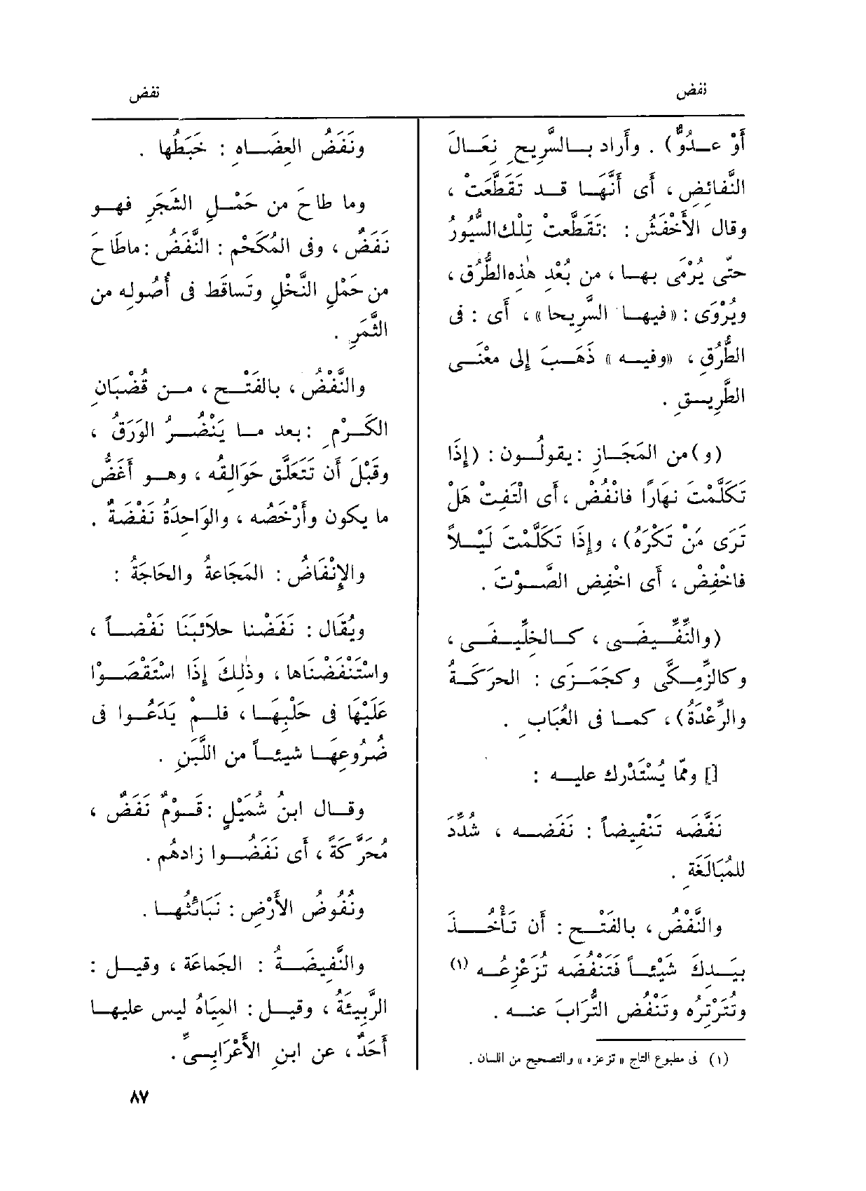 أَو عدوٌّ. وأرادَ بالسَّريحِ نِعالَ النَّفائِضِ، أَي أنَّها قَدْ تَقَطَّعَتْ، وَقَالَ الأَخْفَشُ: تقطَّعَتْ تِلْكَ السُّيُورُ حتَّى يُرمى بهَا، من بُعْدِ هَذِه الطُّرُق، ويُروى: فِيهَا السَّريحا، أَي: فِي الطُّرُقِ، وَفِيه ذَهَبَ إِلَى معنى الطَّريقِ. وَمن المَجَازِ: يَقُولُونَ: إِذا تكلَّمْتَ نَهَارا فانْفُضْ، أَي التَفِتْ هَل تَرى من تَكرهُ، وَإِذا تكلَّمْتَ لَيْلًا فاخْفِضْ، أَي اخْفِض الصَّوْتَ. والنِّفِّيضَى، كالخِلِّيفَى، وكالزِّمِكَّى وكجَمَزَّى: الحركَةُ والرِّعْدَةُ، كَمَا فِي العُبَاب. وممَّا يُسْتَدْرَكُ عَلَيْه: نَفَّضَهُ تَنْفيضاً: نَفَضَه، شُدِّدَ)